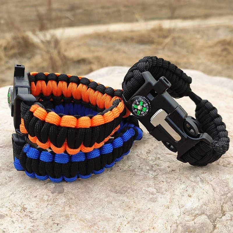1. Распущенная паракордная нить: необходима для завязывания и закрепления походного снаряжения или снаряжения. 2. Свисток: Аварийный свисток для сигнала спасателям. 3. Компас: аккуратная помощь в направлении, вы не потеряете дорогу. 4. Скребок: можно использовать как нож.