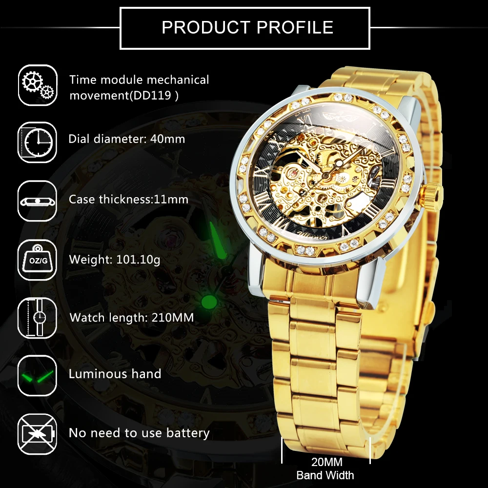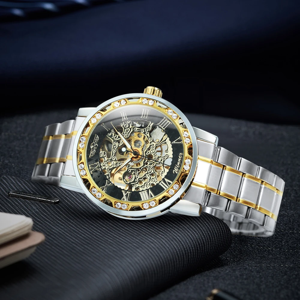 Часы наручные WINNER Мужские механические, брендовые роскошные часы-скелетоны с ремешком из стали, украшенные кристаллами, в стиле унисекс