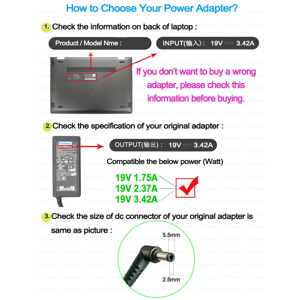 Предупреждение: пожалуйста, внимательно проверьте напряжение, ток и размер наконечника постоянного тока вашего оригинального адаптера перед размещением заказа!Если вы не уверены, работает ли этот адаптер для вашего ноутбука, пожалуйста, оставьте сообщение о заказе вашей модели ноутбука или спросите нас перед заказом, спасибо!