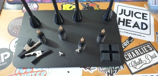 небольшая по размеру приблуда. Устойчивая за счет веса платформы. Удобные гибкие держатели, которые имеют магнитное основание и свободно перемещаются по платформе. При необходимости можно примагнитить на любую металлическую поверхность. для крепления фена есть винты с барашками