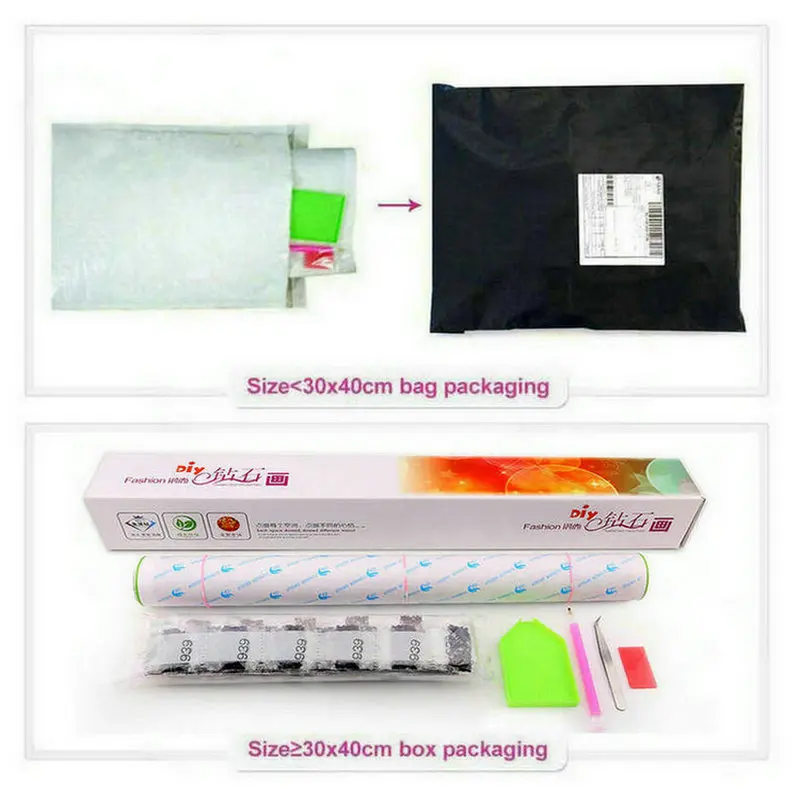 Kit containsCanvas, resin diamonds, tools, point drill pens, tweezers, trays, clay