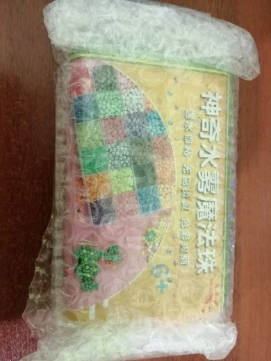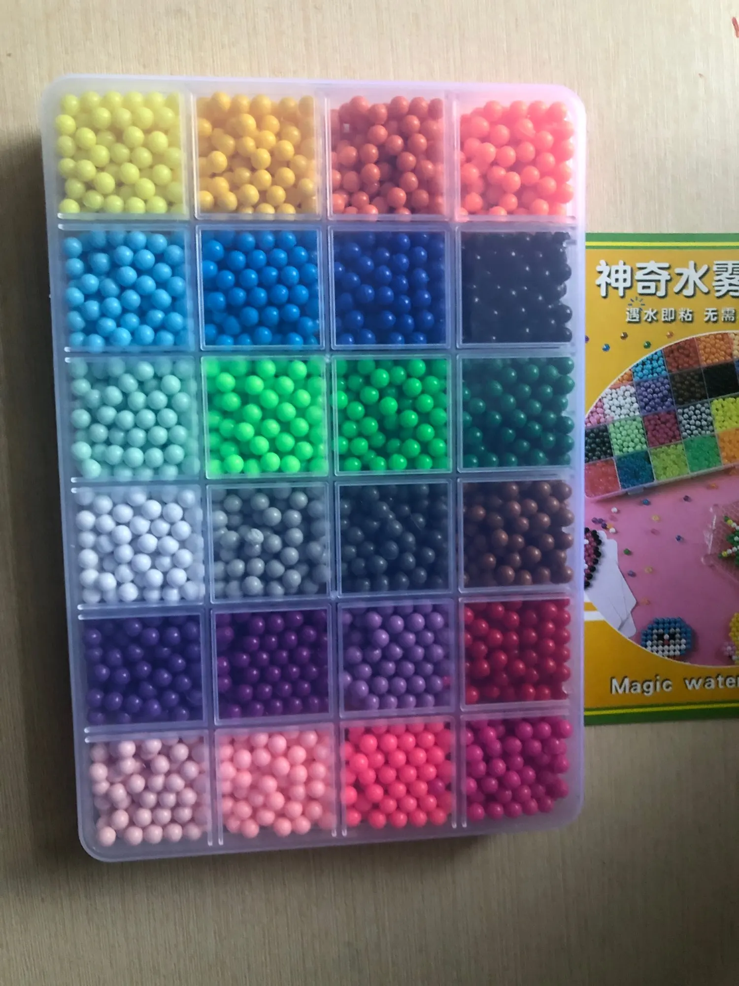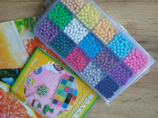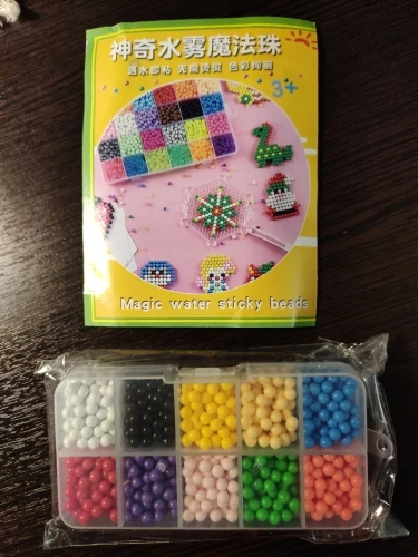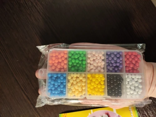 Пришло в обещанный срок. Шарики в центре перемешались во время доставки. Упаковано в защитный воздушный пакет, но один угол ящика оказался разбит. При распаковке шарики с этого угла рассыпались. Подходит для оригинальной ручки aquabeads, иногда выскакивает по 2 шарика. Черный мажется, пока не высохнет. Качество чуть ниже оригинальных, но за эту цену считаю - отличный вариант.