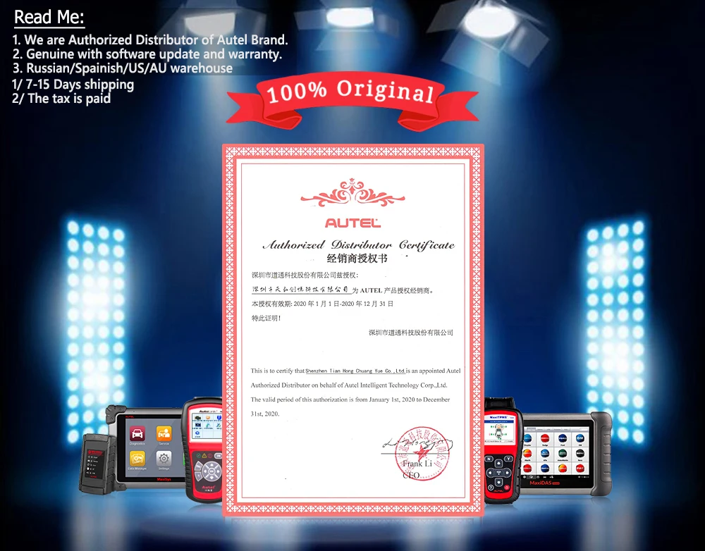 1. Мы являемся авторизованным дистрибьютором бренда Autel, 100% Новый оригинал Autel с обновлением программного обеспечения и гарантией. Если нет, то будет предоставлена двойная компенсация!2. Autel Autolink AL619 поддерживает несколько языков: английский, французский, испанский, немецкий, голландский, шведский, польский, корейский, японский, итальянский. (Пожалуйста, оставьте S/N машины для авторизации языка, который вы хотите после получения.)2. Доставка за пределы склада:1/из Китая: все страны (DHL/Fedex: 15-60 дней отгрузки.)2/из Испании: европейские страны, мы заплатили налог. (7-15 дней отгрузки)3/из США: США, мы заплатили налог. (7-15 дней отгрузки)4/из Австралии: Autralia, мы заплатили налог. (7-15 дней отгрузки)5/из России: Россия, мы заплатили налог. (7-15 дней отгрузки)