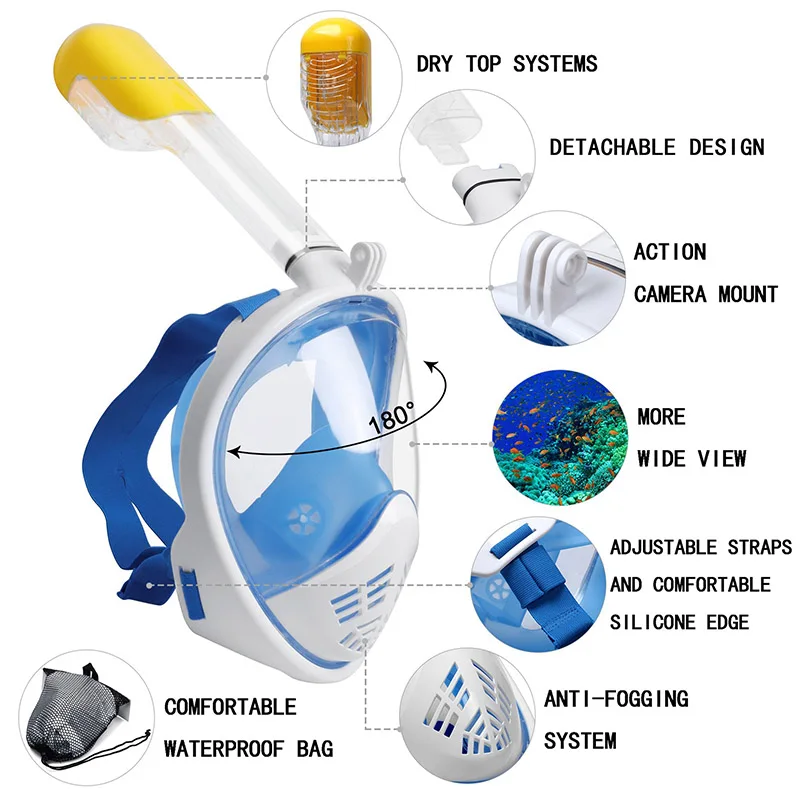 Маска для подводного плавания для взрослых, Полнолицевая, противотуманная, с широким обзором, водонепроницаемая, с креплением для камеры