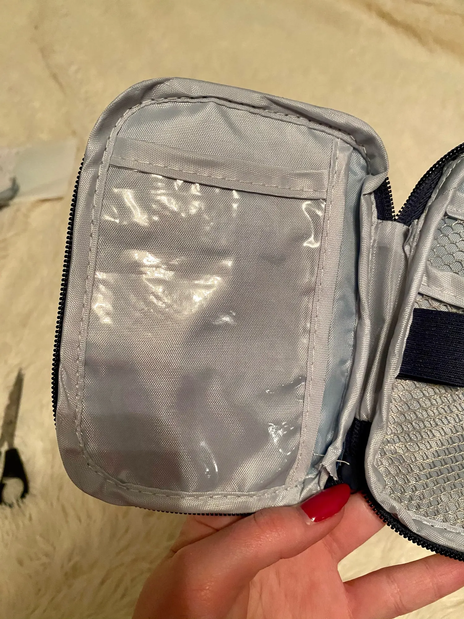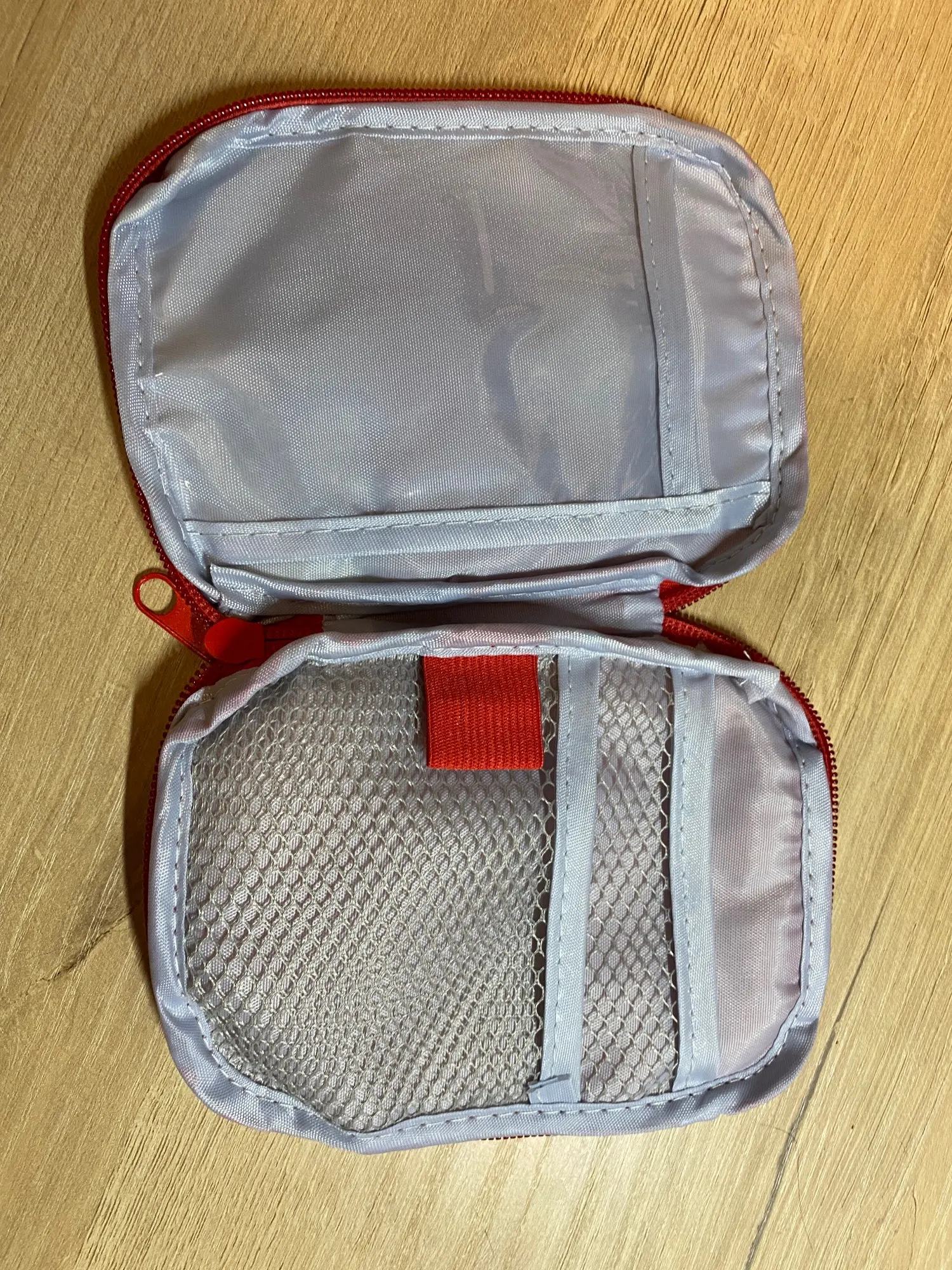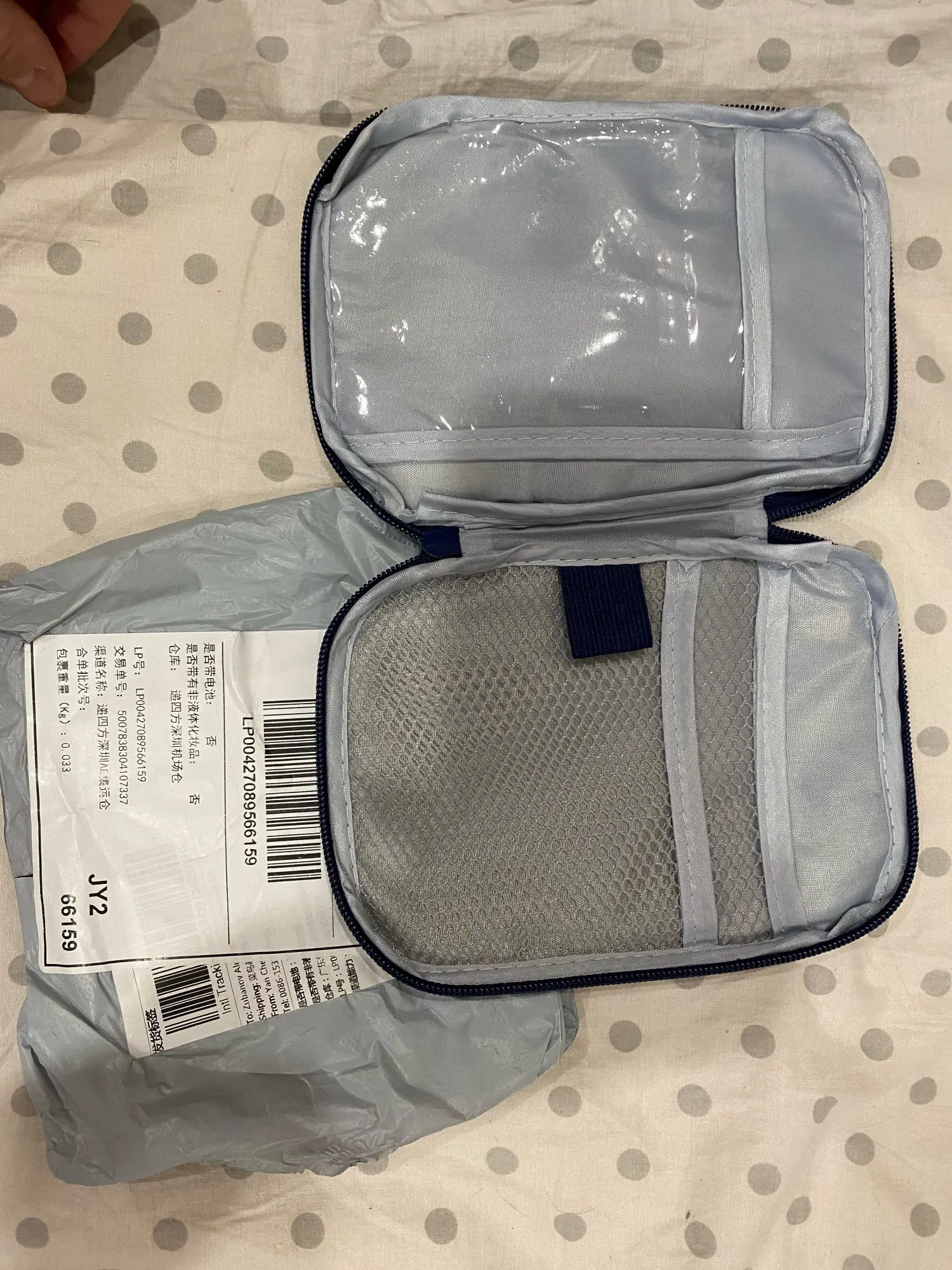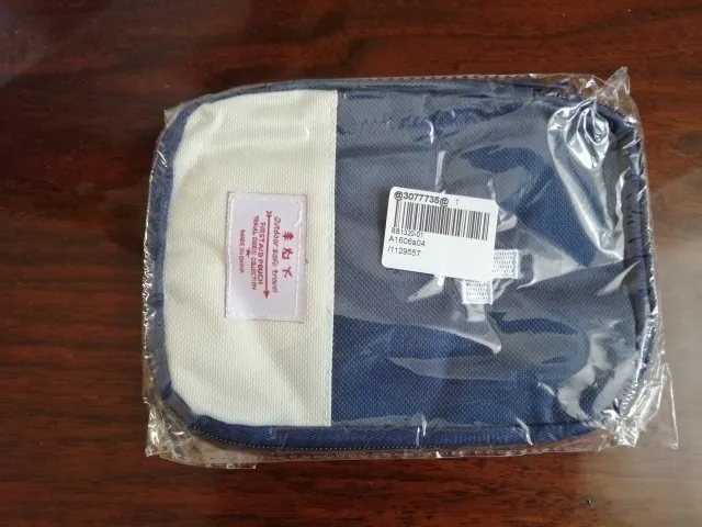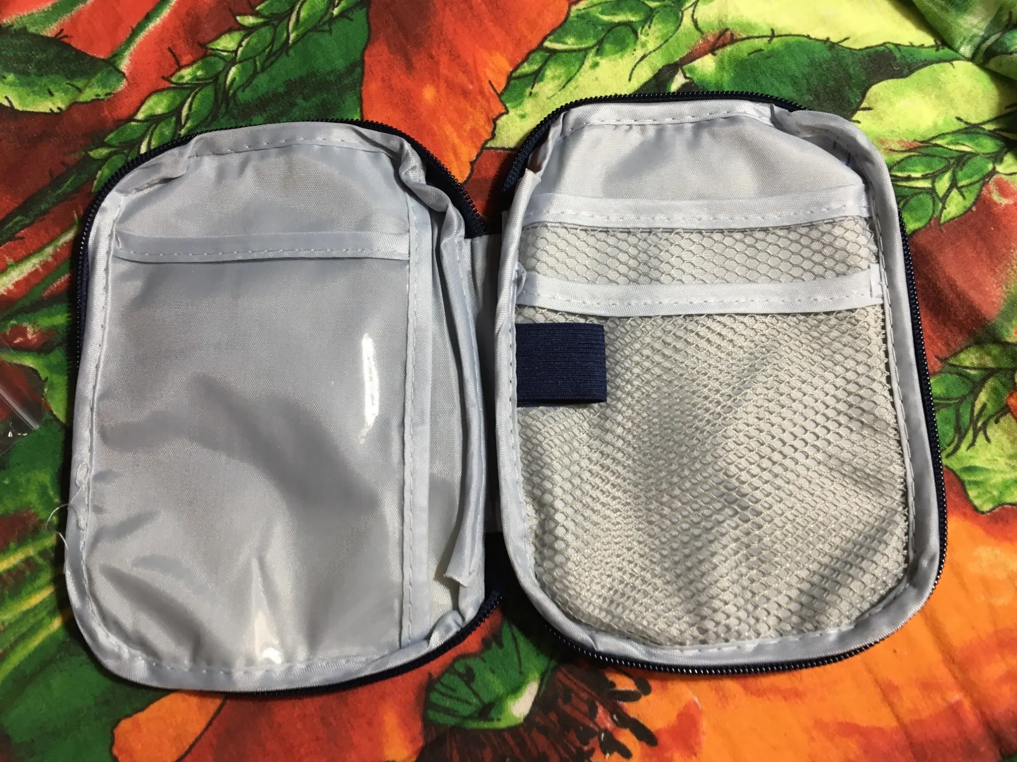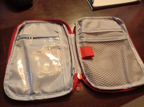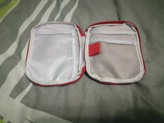 item looks just like the picture, has that new item smell. I'm sure it will go away in time. quite a few pockets for storage. I'm sure it will hold a few band aids and maybe some small medicine. perfect size to keep in the glove box of the car. actually might be suitable for clean mask storage. item came super fast. three weeks to North America with free shipping. stuff I ordered before with tracking still have not arrived