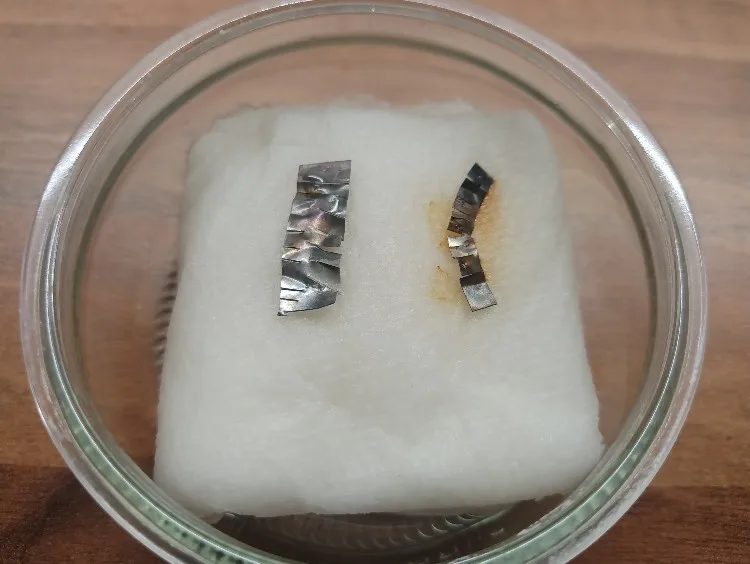 Очень хорошая полоска. У меня есть полоса, проверенная на подлинность никеля, чтобы убедиться, что она не покрыта металлом. Полоса светится на магните (меньше, чем железо или Кобальт). Затем у меня есть кусок никелированной стали и этот никелполосный опгекнипт и красный горячий. Затем у меня есть несколько часов в одной миске, в соленой воде, с тканью под ней. Разница была ясной, и эта полоса одобрена. Смотрите фотографии!