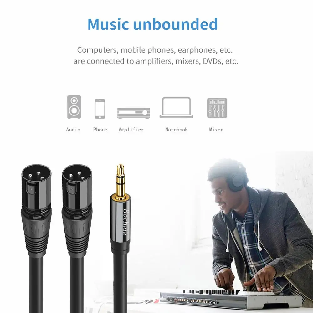Описание 1, Длина, есть в наличии: 1,5 м, 3 м, 5 м (A) 1,5 метр полной длины (ветка Длина кабеля: около 50 см слева и справа) (B) 3 метра полной длины (длина кабеля ветки: около 1 м каждая сторона) (C):5 м полная длина (соединительный кабель около 2 м с каждой стороны) 2. Цвет: черный 3, Тип: 3,5 мм стерео Aux Jack с двойным XLR Мужской кабель 4. Этот кабель идеально подходит для подключения цифрового медиаплеера или аналогичного аудиооборудования dedice к pro, он отлично подходит для мобильных телефонов, планшетов, ноутбуков, или аналогичные устройства, когда вам нужно подключить их к микшерной консоли 5, фольга + внутренний Плетеный экранированный + OFC медный сердечник с гибкой резиной для лучшей производительности и более длительного срока службы 6. Название бренда: Bochara 7, диаметр кабеля: 6 мм (OD 6,0) Внимание: этот кабель не используется для подключения микрофонов