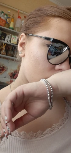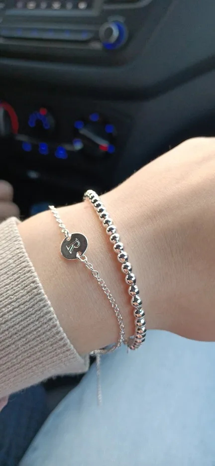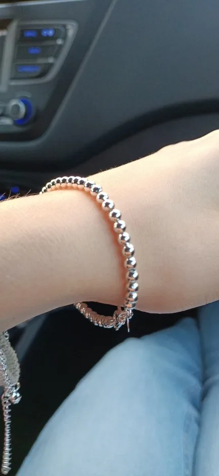 Отличный браслетик. Сверкает на солнце.Шарики нанизаны на цепочку,которая со временем растянется примерно на 1 шарик, и шарики будут сидеть неплотно. А также, это,конечно,никакое не серебро за 61 рубль.Облезет где-то через 1-1.5 месяца.На моих фото рядом с новым браслетом старый,который я носила не снимая где-то пару месяцев. Смотрите как он облез.А цепочка внутри покраснела.Ну..за 61 рубль месяц поносить-считаю весьма недурственный результат.Кучу посылок объединили в одну, поэтому пришла посылка быстро (2,5 недели), трек отслеживался, забрала на почте. Я среднего телосложения,размер где-то 48 российский,и мне браслет -самое оно (чуть свободный). На полную руку будет мал. На слишком худую...наверное,слетит,т.к. размер не регулируемый (только одно ушко для застежки)