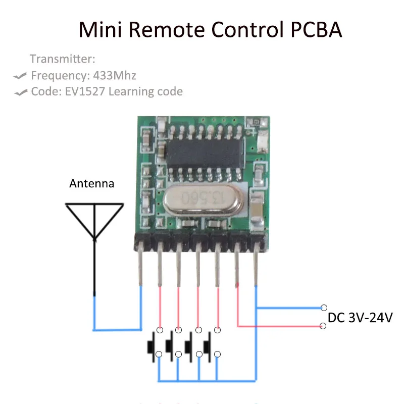 Особенности продукта Модуль приемника (RX480E) Рабочее напряжение: DC 3,3 ~ 5V Ток покоя: менее 5 мА Выходной ток: 10 мА Каналы: 4 канала Частота RF: 433 МГц Диапазон частот: + 0,2 МГц-0,2 МГц Рабочая температура: -25 ~ + 75 градусов Чувствительность приема:-108дб Количество пульта дистанционного управления: 25 шт. Поддержка кодирования: код EV1527 Режим работы RF: ASK superгетеродинный беспроводной прием Размер: 28*12. 3*6 (мм) Диапазон приема: выше 15 метров (открытое пространство) Удаленный режим работы: Мгновенный режим/режим переключения/режим блокировки