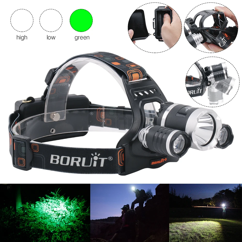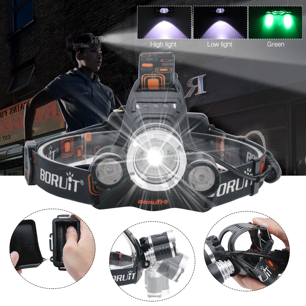 Налобный фонарь BORUIT, светодиодный налобный фонарь XM-T6 лм + 2 * XPE, зеленый, 3 режима, зарядное устройство USB, налобный фонарь фиолетового цвета, для рыбалки