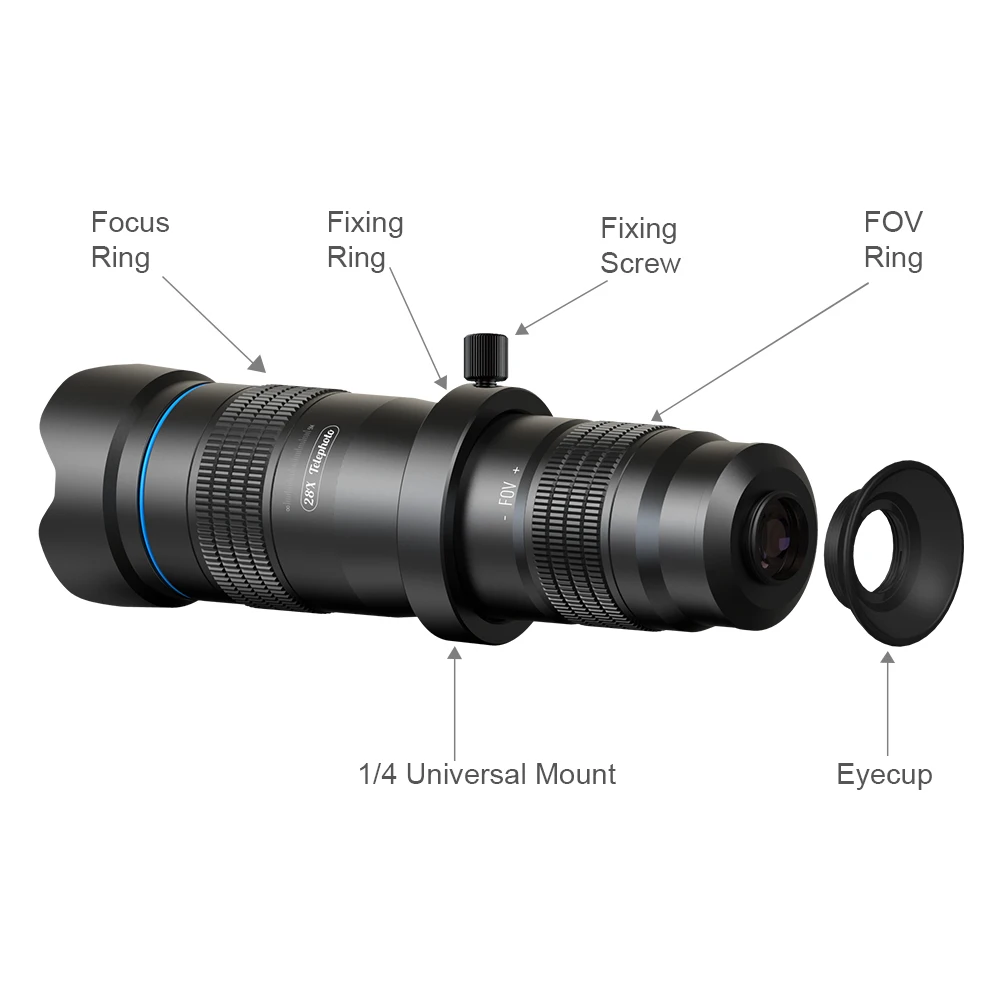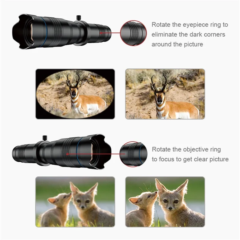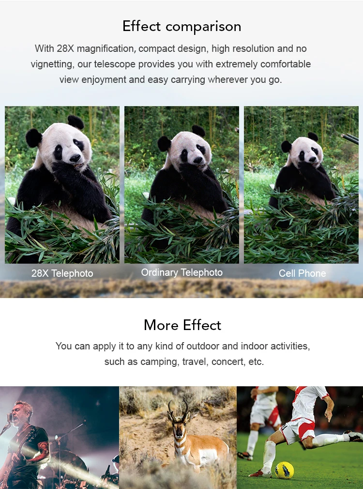Особенности: Это новый разработанный высококачественный оптический зум-объектив 28X для телескопа + мини-штатив + дистанционный затвор, который удовлетворяет ваши различные потребности в фотографировании. Продуманный дизайн с прочным штативом: Этот телеобъектив для мобильного телефона также поставляется со сбалансированным штативом, а штатив может быть селфи-палкой. Мы можем поместить телефон в прочный регулируемый штатив после подключения объектива. Также Используйте штатив в качестве мини-селфи-палки FMC Полностью многослойное покрытие, изготовлено с передовым Lanthanide оптическим стеклом для HD изображений. Подходит для большинства мобильных телефонов, включая iPhone X, 8/8 Plus, 7/7 Plus, 6/6s/6 Plus, 5, Samsung GALAXY S6, S6 Edge, S5, LG и почти все другие смартфоны на рынке. Комплект линз идеально подходит для всех, от вашего BF до ваших родителей. Он помещается в кармане и прост в установке, переноске и хранении, снимает вечерние фотографии, музыкальный фестиваль, кемпинг, туризм, путешествия, наблюдение за птицами и т. д. и сохраняет все ваши восхитительные воспоминания. Параметры: Увеличение: 28X Материал: многослойная оптика + алюминиевый сплав + АБС-пластик Угол обзора: 6,8 Длина: 159 мм Конструкция: 6 элементов 4 группы Интерфейс: M17xP0.75
