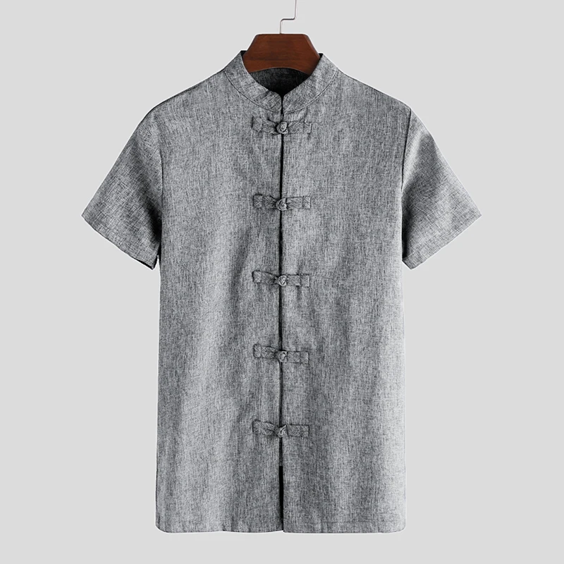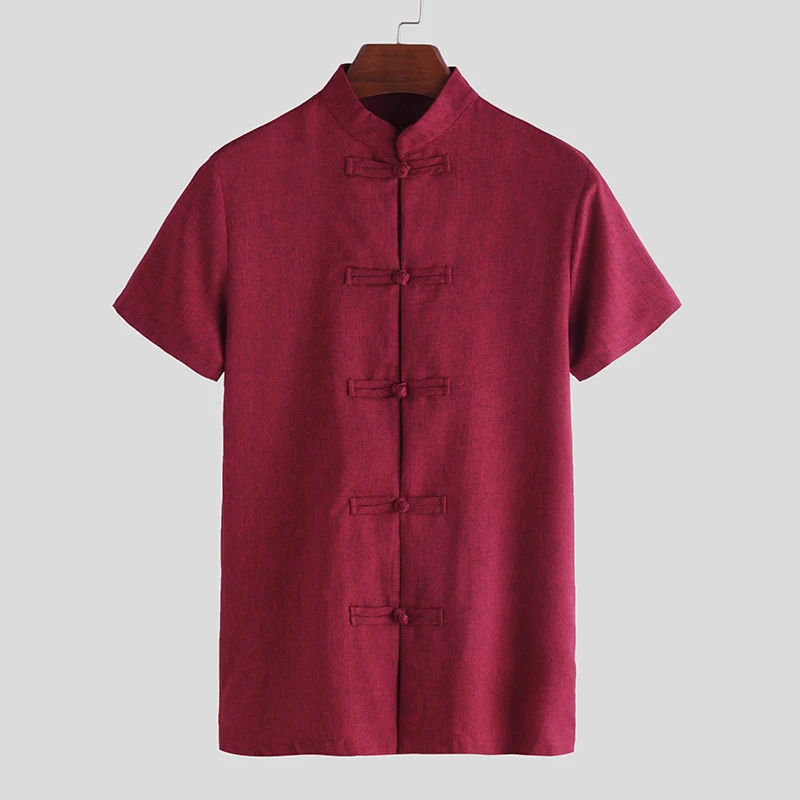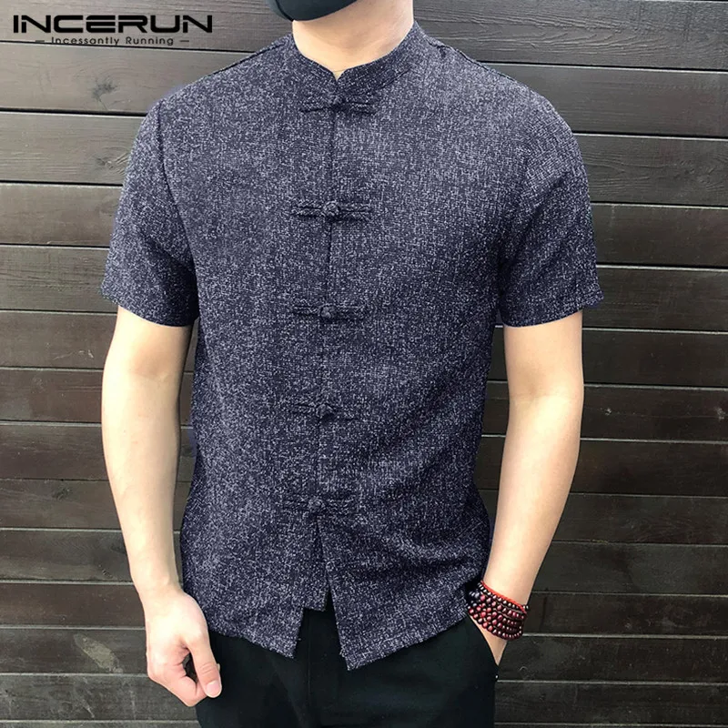 Мужская рубашка INCERUN, в китайском стиле, с воротником-стойкой, с коротким рукавом, повседневная, свободная, однотонная, винтажная, костюм Тан, 2021