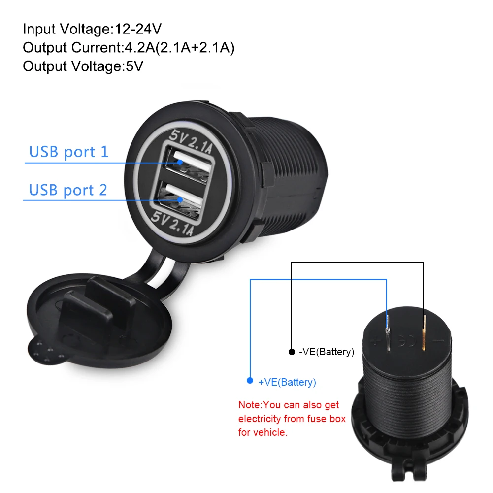 Защита от короткого замыкания/перегрева.Usb-розетка 5 В до 2,1 А,Водонепроницаемые защитные колпачки и usb-крышка.Многофункциональный продукт с синим светодиодный светильник, идеально подходит для путешествий.Водонепроницаемый пылезащитный материал используется для внутреннего и наружного применения.Может устанавливаться вертикально, горизонтально или под приборной панелью или любой плоской поверхностью.Широко используется с электрическим оборудованием для питания: автомобиль, GPS, мобильный телефон, камера, mp3 (может курить)Оптимизировано для iPad, для iPhone и iPod-быстрая зарядка на полной скорости (2,1 ампер для iPad, 1Amp для iPhone/iPod).Применяется ко всем мобильным телефонам с usb-зарядкой или другим электронным продуктам. Запускайте несколько аксессуаров одновременно, очень удобно и просто в использовании.Предостережения:Проверьте максимальное напряжение на устройствах, чтобы заряжаться заранее.Всегда закрывайте отверстия, когда noy используется для попадания пыли и воды.Этот продукт предназначен только для транспортных средств 12/32 В.Используйте только на специфике напряжения.Не используйте это устройство во время вождения.