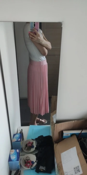 Юбка простая, ткань не хлопок, но приятная. На ощупь немного шероховатя. Мой рост 1м 65см Размер нашу S , обхват талии 65, обх.бёдер 92. Села хорошо, свободно, но не висит. Подклада конечно нет, ткань тонковата. Один шов, бирок нет. Незнаю как будет после стирки, потом дополню отзыв. До Алматы шла больше месяца, долго не двигалась посылка у нас в стране уже по прибытию.