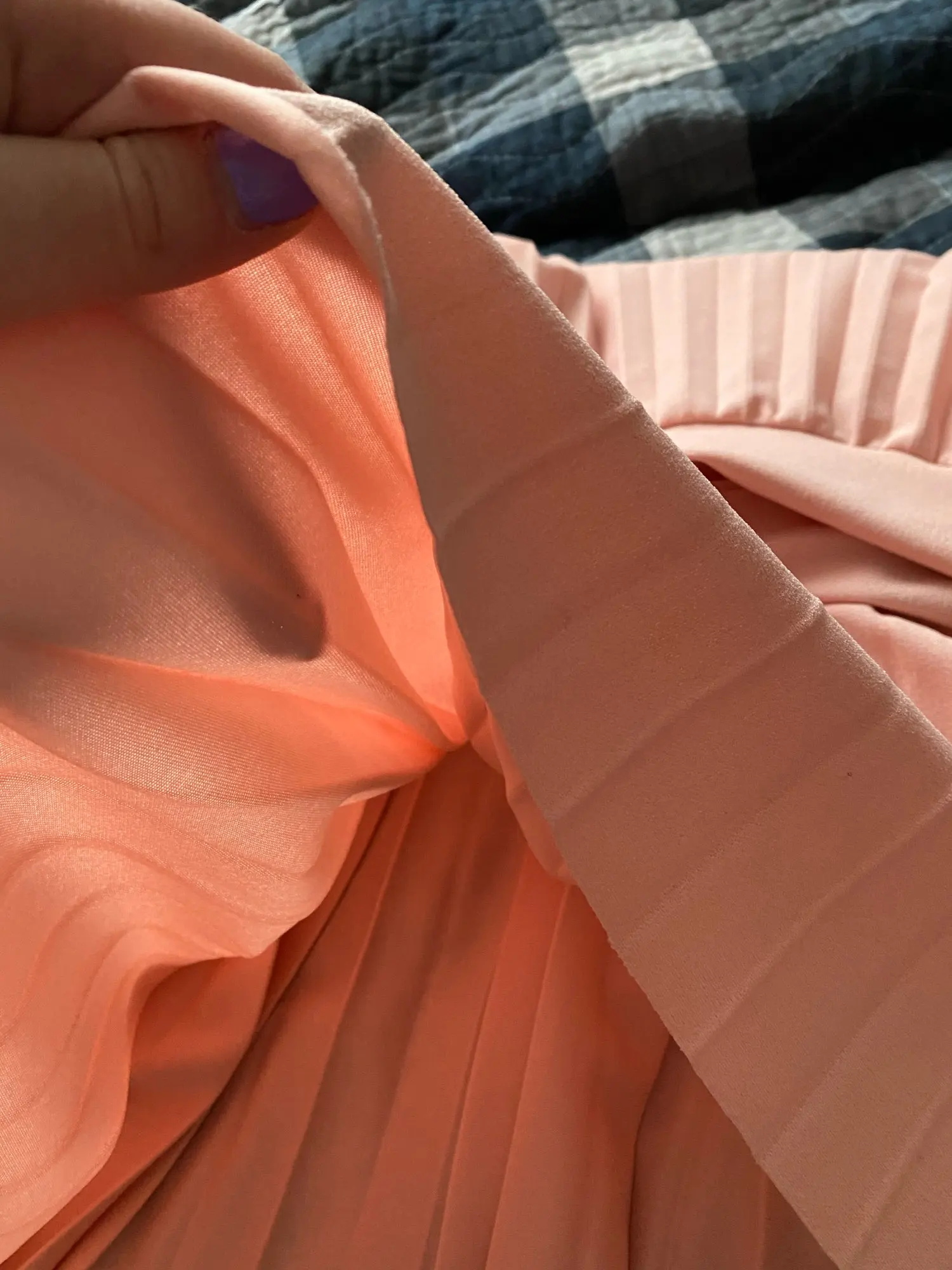 Отличная юбка, лёгкая, красивая, длиной на рост 170 чуть чуть ниже колена. Без подклады, но материал относительно плотный, однако темное белье просвечивает, светлое, только если юбкой обтянуть попу. Резинка в самый раз, не очень сильная, удобная, и по ширине хорошо. Швы ровные, но снизу не подшита. Все равно юбка классная, закажу ещё в других цветах.