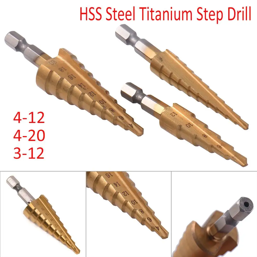 3 шт.компл. ступенчатые сверла из быстрорежущей стали с титановым покрытием ступенчатые конусные инструменты для деревообработки металла 3-12 мм 4-12 мм 4-20 мм #10