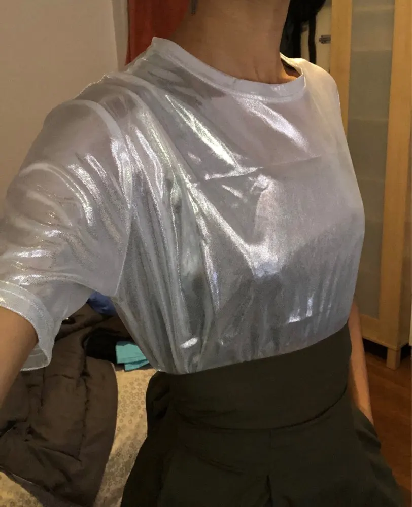 Мне нравится истина, на фото она выглядит белее, но мне нравится еще больше, чем цвет, который пришел ко мне, ткань-чудо текстуры и всего остального, выглядит как пластик, но растягивается и гибкий, мне нужен вариант этого материала в короткой и плотной футболке, Доставка занимает 20 дней.