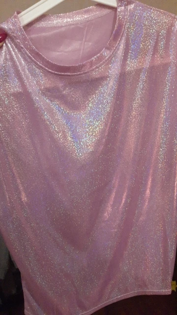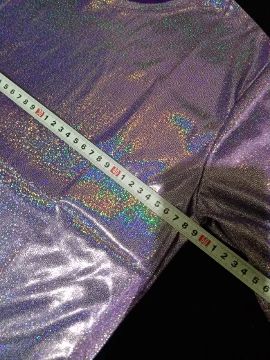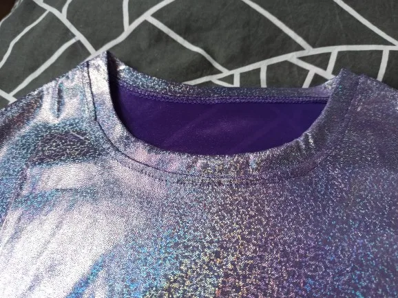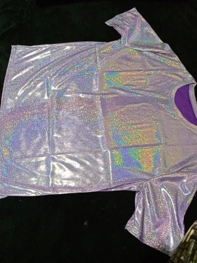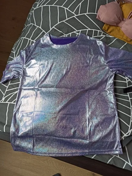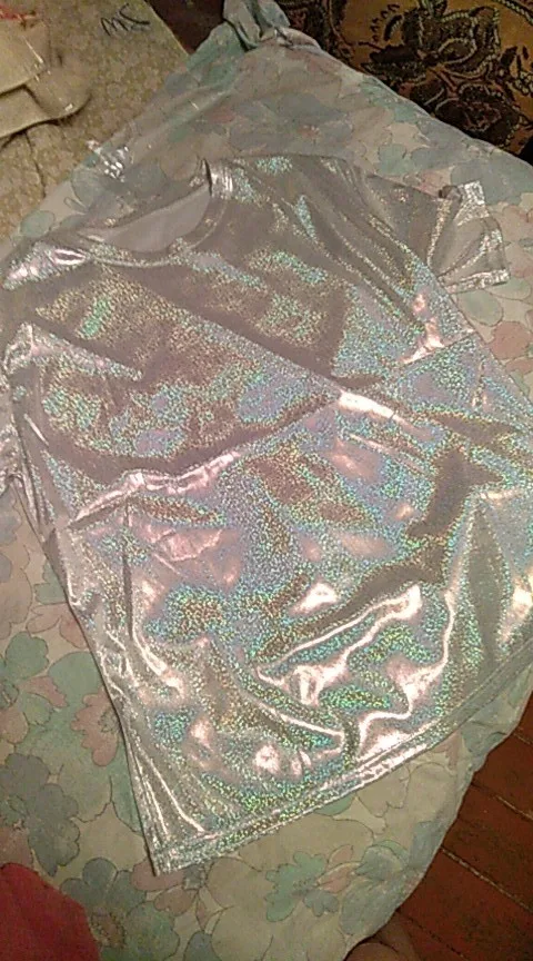 Очень красивая футболка. Пошив аккуратный, ткань голографическая, немного липнет. Идеально подошла на рост 152 см ( не длинная), вес 42 кг. Швы оверлочены, горловина удобная. Бирок на изделии нет. Доставка 19 дней с момента оплаты заказа. Рекомендую.