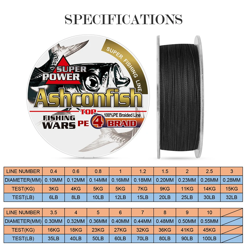Ашконфиш 1 00 М 3 Полиэтиленовая рыболовная леска, 4 пряди, 00 М 20 25 30 35 40 50 60 70 80 90 100 LB многонитевая леска 0,1-0,55 мм