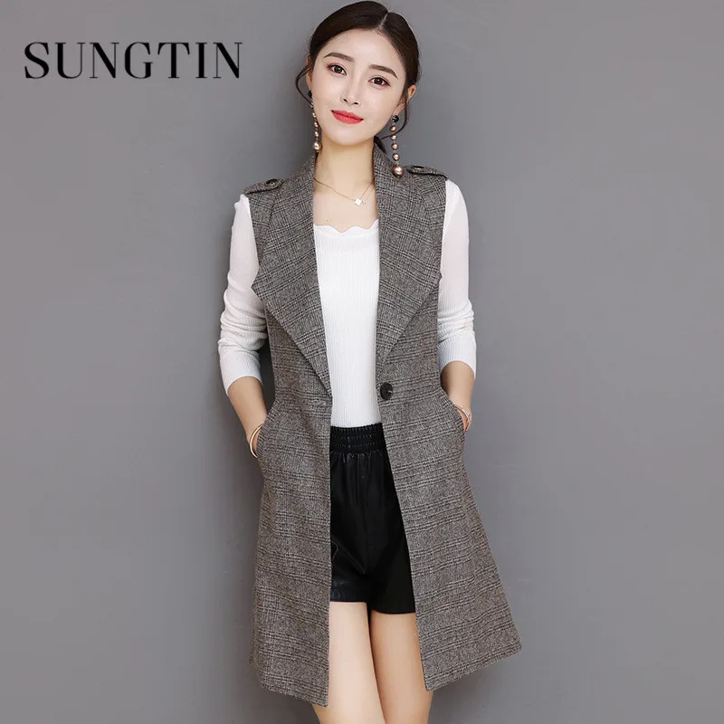 Женский блейзер без рукавов Sungtin, классический длинный пиджак в клетку, для офиса, размера плюс