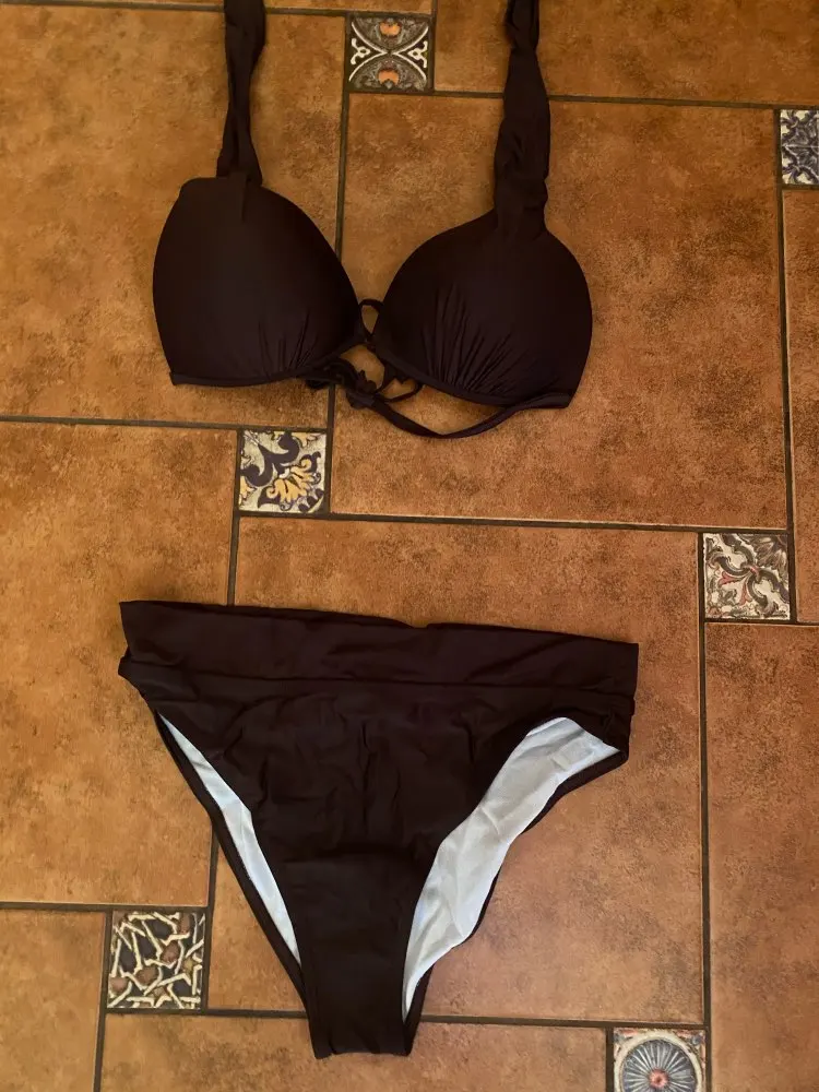 Цвет насыщенный, шоколадный, очень красивый. На ОГ=88 см и ОБ=92 см купальник сел. Плавки сели плотно. Верх великоват, вполне подойдет на более большую грудь. Спасибо продавцу.