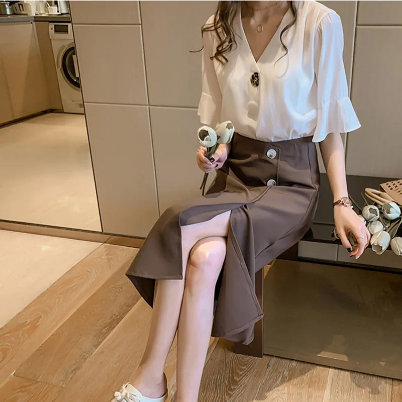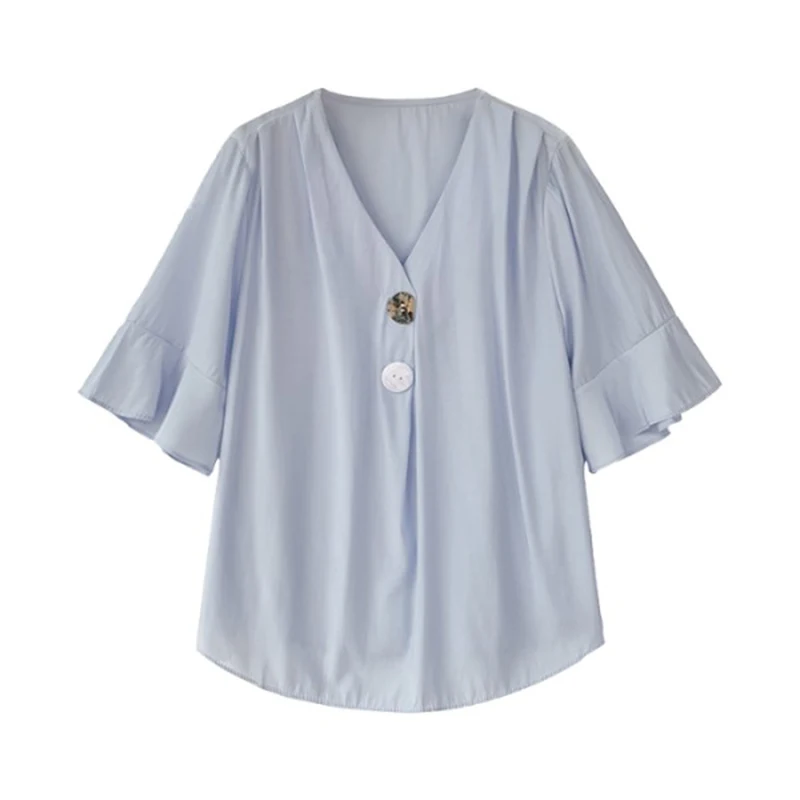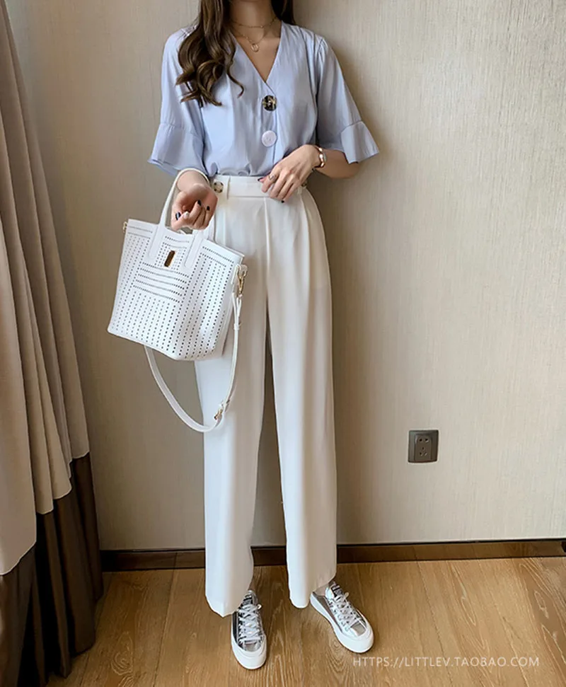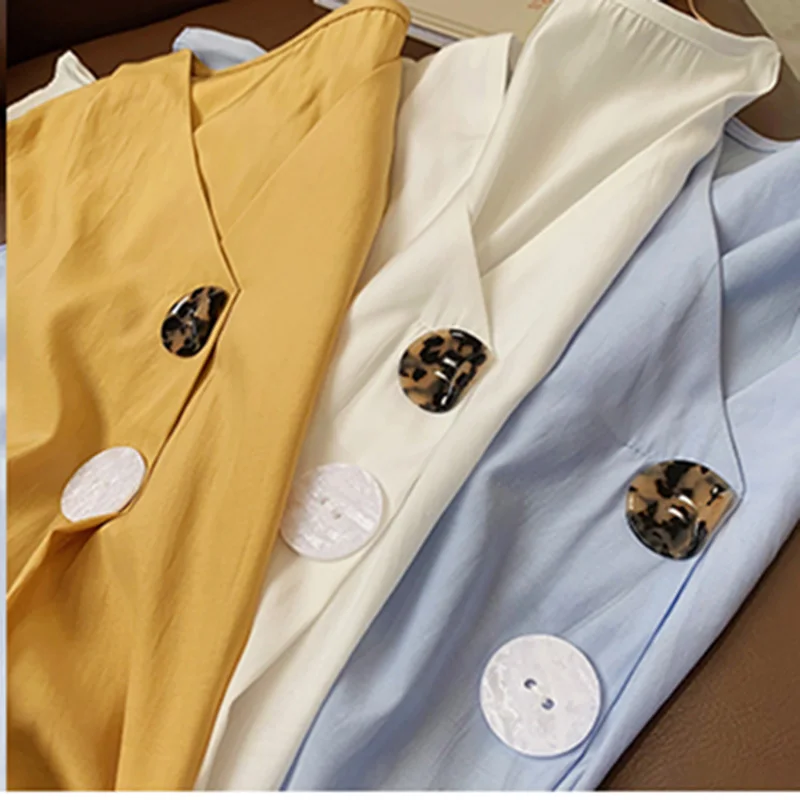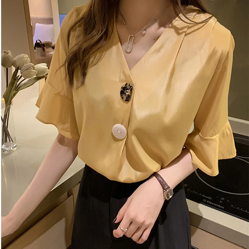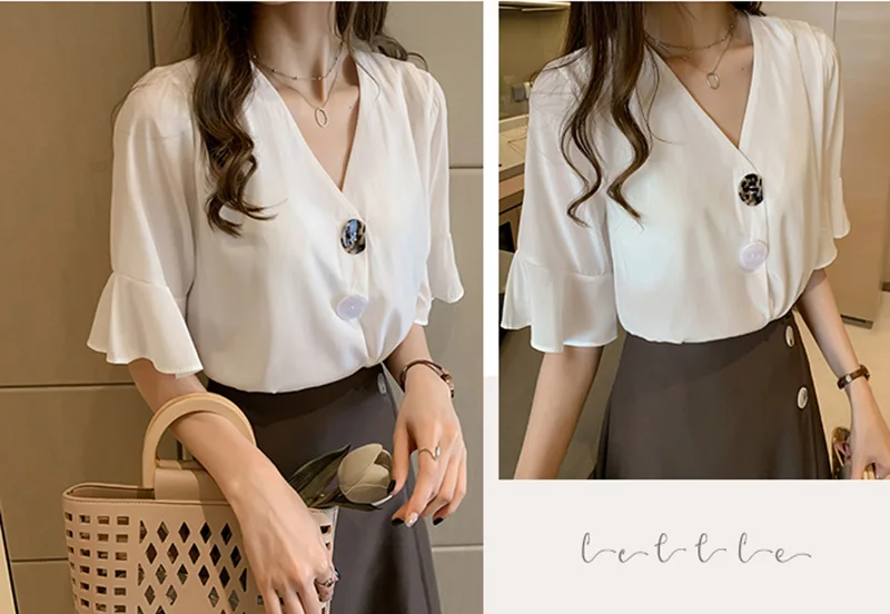 Шифоновая женская блузка, летняя рубашка, новинка 2019, свободная женская блузка с V-образным вырезом, корейские версии, женские блузки, рубашки, белыйсинийжелтый