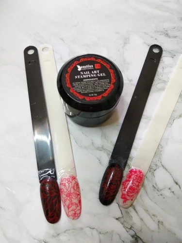Долго ждала, гель работает, но на разных пластина по разному работает. На тонкой гравировка прекрасно берётся и переносится, на рисунках покрупнее, куда нужно много краски, сьезжает как по маслу. Не однозначно мнение. Буду тестировать на разных поверхностях . Сохнет хорошо, не ползёт за топом и не смазывается спиртом, как от rozalind это большой + попробую на матовом топе, может будит эффект лучше.