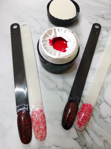 Краска просто супер! Заказала сначала на пробу черную и красную + паутинку и 3 д пасту. Вся продукция очень понравилась, сделала ещё заказ, и теперь у меня есть все красочки. Отлично подходит для стемпинга, хорошо отпечатывается с любых пластин, силиконовым прозрачным штампиком, ,очень экономичный расход Подойдёт для китайки, использую для прорисовки тонких линий. Пигментация очень сильная, толстым слоем не просохнет. Сушить нужно подольше иначе тянется за топом.