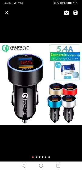 Хорошее авто зарядное устройство, в прикуриватель. Работает, ток не измерял, но Самсунг А40 не показывает быструю зарядку. Напряжение показывает точно (бортовое). Продавец положил небольшой подарок - похож на концентрат стеклоомывающей жидкости (1 таблетку), пустяк, а приятно. Рекомендую! Продавцу огромное спасибо, за подарок
