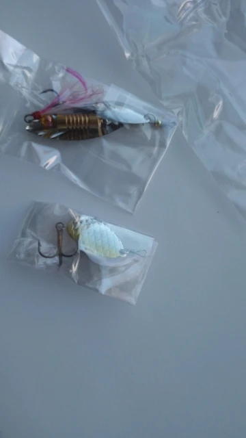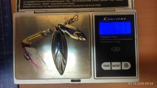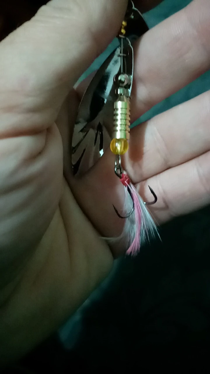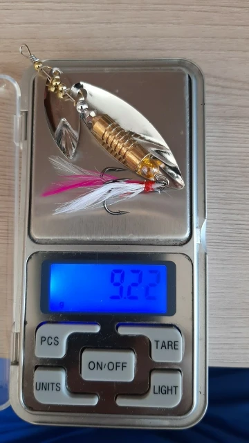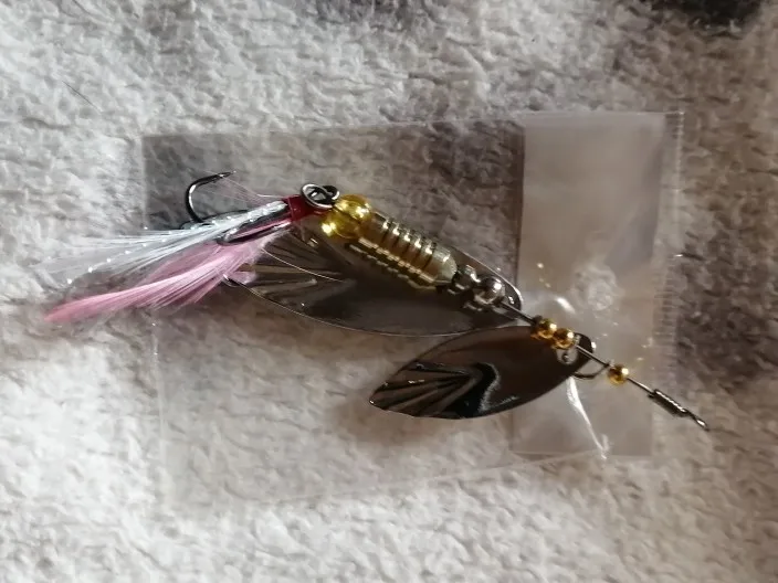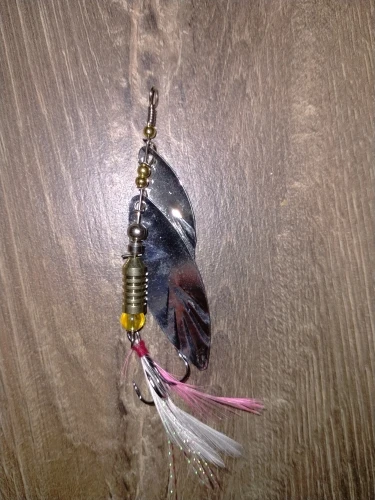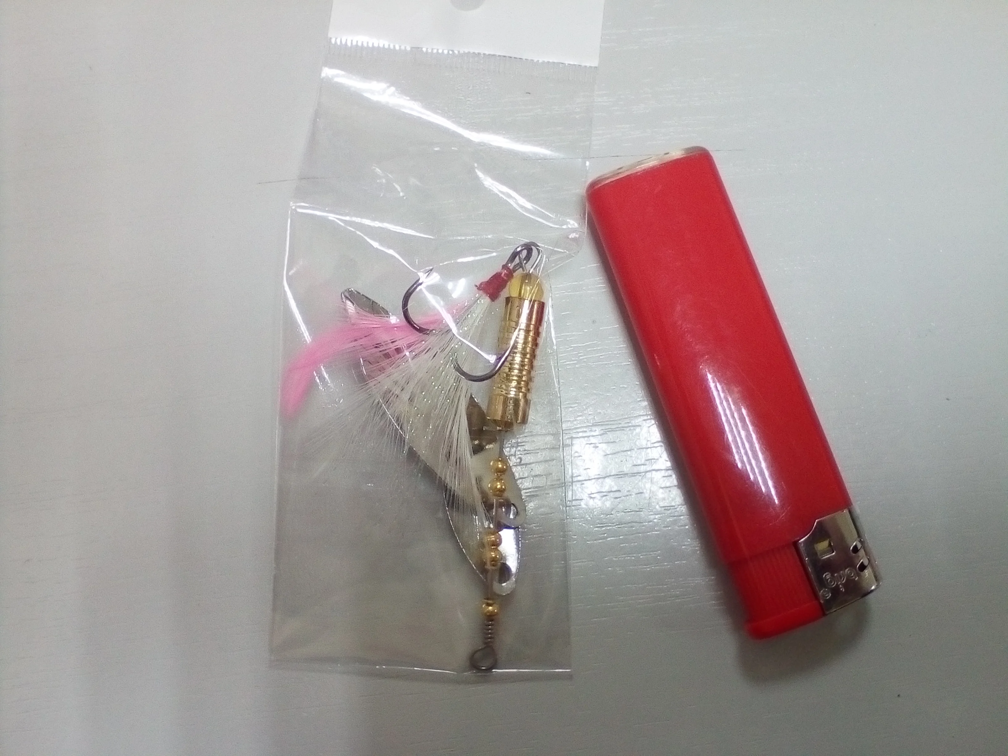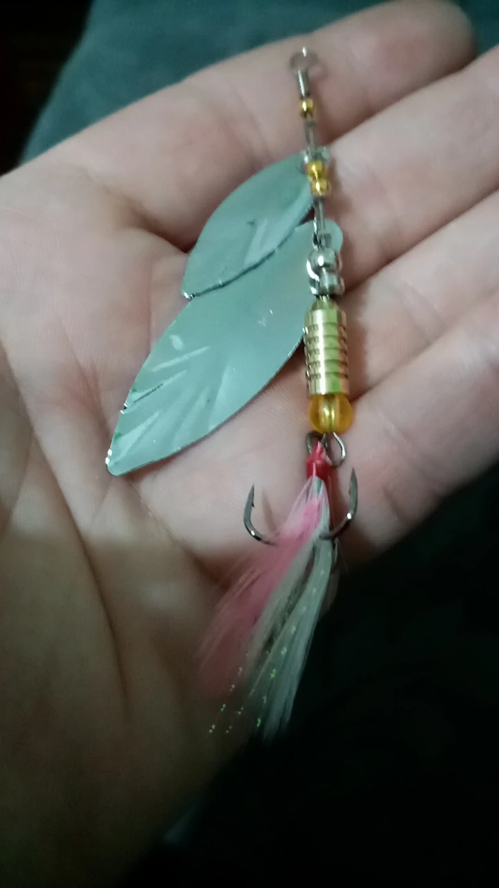 маленькая блесна, лёгкая очень, 3 крючка. не успели попробовать, уже холодно