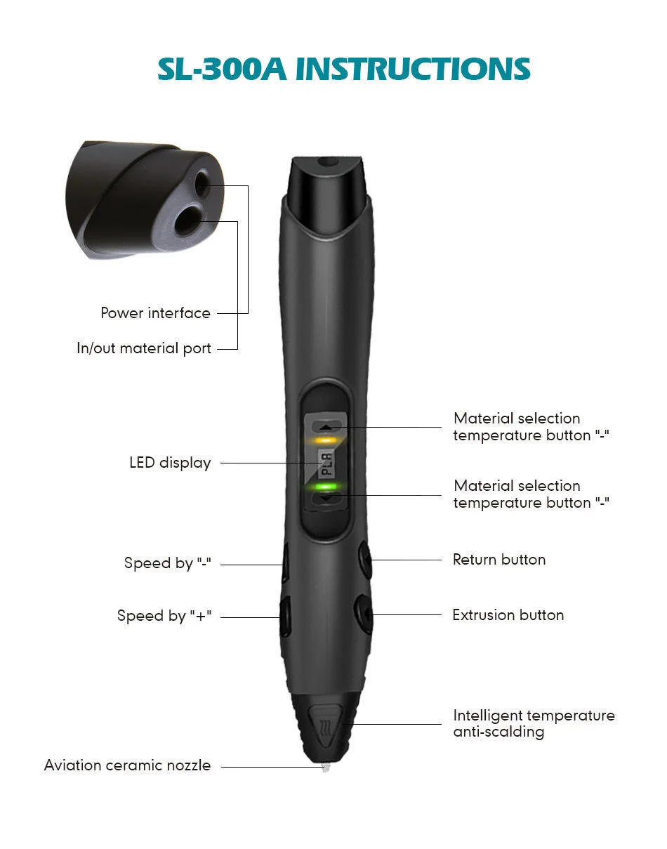 Название: SL-300AКоличество: 1 * ручка, 1 * руководство, 2 * нить, 2 * крышка пальца, 1 * USB кабельПрименимый материал: 1,75 мм PLA/ABS/PCLОптимальная температура: АБС 180-210 ℃PLA 160-180 ℃PCL 50-60 ℃Цвет: черный и белый, черный и серый,Черный и синий, черный и зеленыйВходная мощность: DC5V 2A 10WВход питания адаптера: AC100-240V50/60HZ 0.35AГарантия: один год