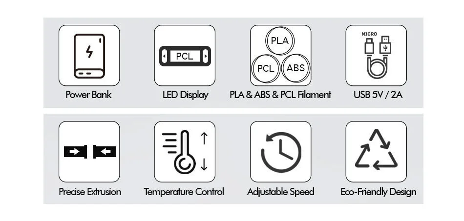 * USB-DC питание от внешнего аккумулятора или адаптера.* Поддержка PLA/ABS/PCL нити.* 1-8 цифровых экструдированных рангов по контролю скорости.* Регулировка температуры.* Светодиодный экран показывает режим работы.* Неблокированное и сменное сопло.