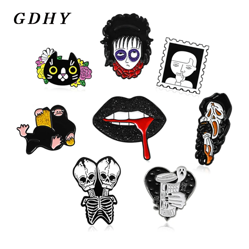 Черно-белые булавки GDHY, эмалированная брошь с изображением скелета зомби, смерти, дьявола, губ, кота