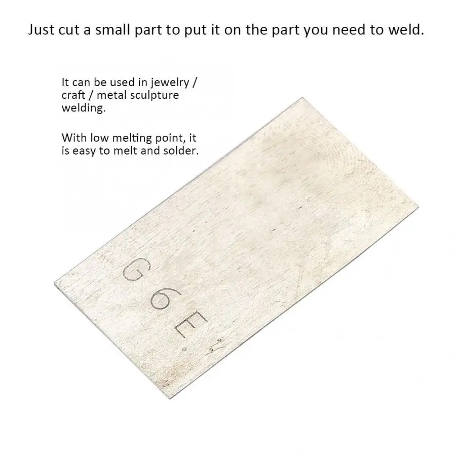 Особенности: 1. Изготовлен из высококачественного материала, прочный и прочный. 2. Подходит для серебряной сварки, очень практично. 3. Просто отрежьте небольшую часть, чтобы положить ее на часть, которую вам нужно сварить. 4. Он может быть использован в ювелирных изделиях/ремеслах/металлической скульптуры сварки. 5. С низкой температурой плавления, легко плавить и паять. Спецификация: Состояние: 100% новый Материал: 70% серебро Цвет: как показано на фотографии Размеры: прибл. 3,5*1,9 см/1,4 * 0.7in В комплект входит: 1 * серебряные паяльные пластины