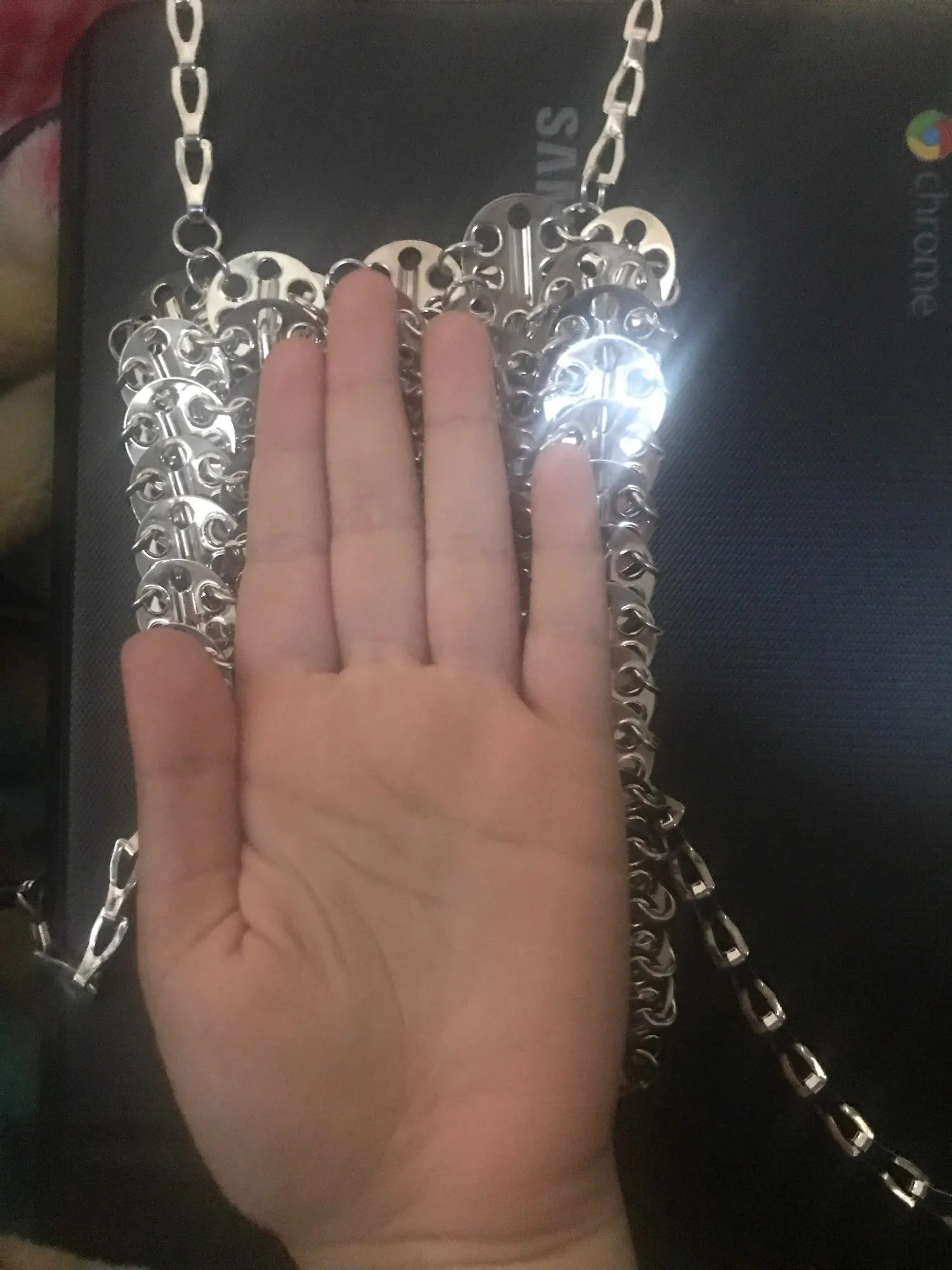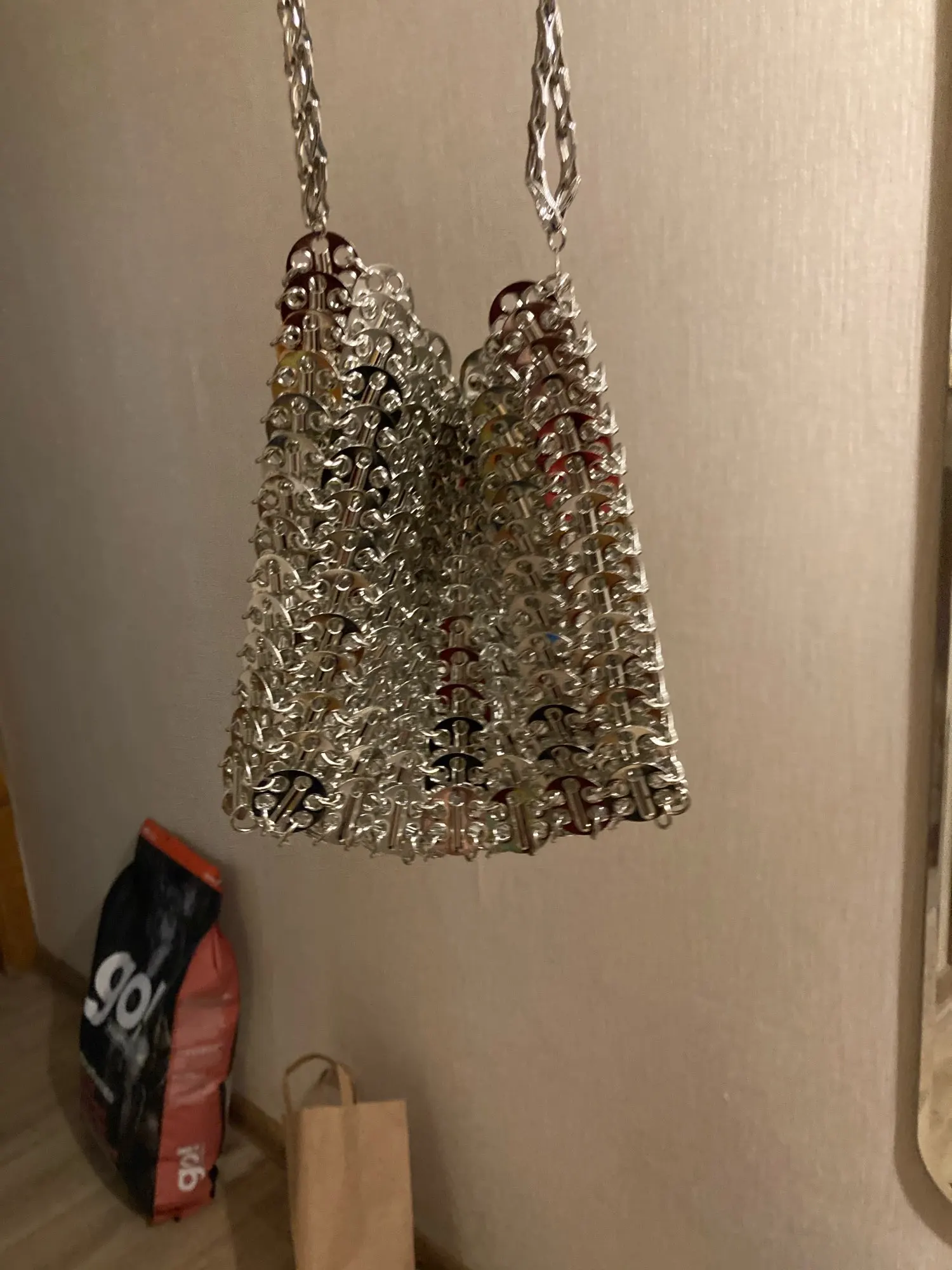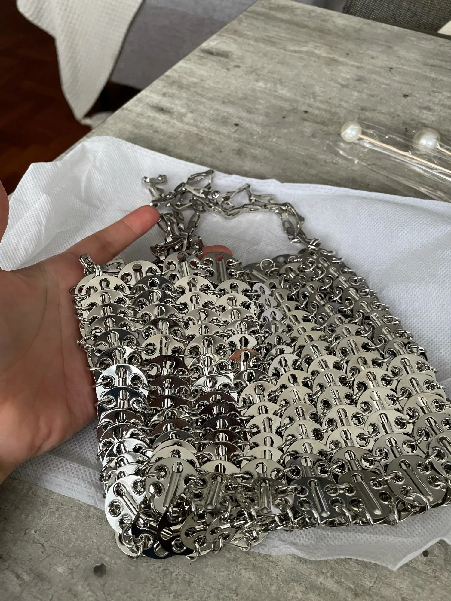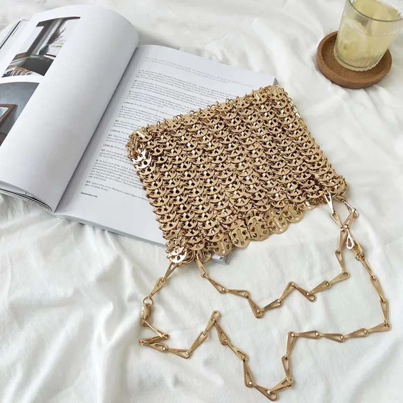 Сумка женская вечерняя, серебристая, с металлическими блестками и цепочкой