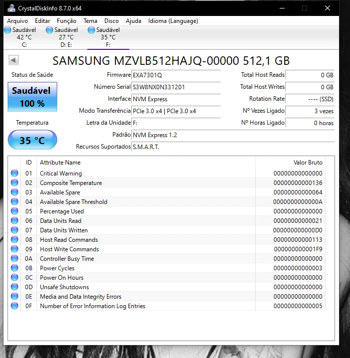 Та же спецификация! Тесты на кристаллах показывают чтение 3400 МБ/с./с и запись 1900 МБ/с./с в моем NVME SSD 512 ГБ. Я использую радиатор для температуры. После испытаний кристаллического диска Максимальная температура составляет 48 °C. Я думаю, что это не настоящий SSD Samsung, потому что у меня есть настоящий SSD Samsung, и программное обеспечение «Samsung magicig» не показывает слово «подлинный» NVME и показывает на мой SSD подлинный, И не показывает информацию о драйверах. Но цена отличная для спецификации nvme samsung или нет. Я из Бразилии и не оплачиваю дополнительные налоги.