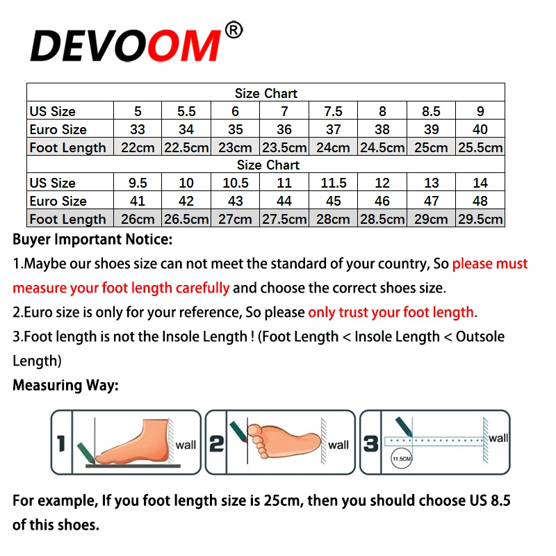 1. Возможно, размер нашей обуви не соответствует стандарту вашей страны, поэтому, пожалуйстаНеобходимо тщательно измерить длину вашей стопы и выбрать правильный размер обуви.