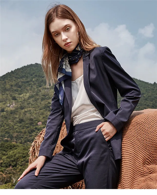 Костюм брючный Женский приталенный, куртка с длинным рукавом, элегантный пиджак с воротником-стойкой, темно-синий