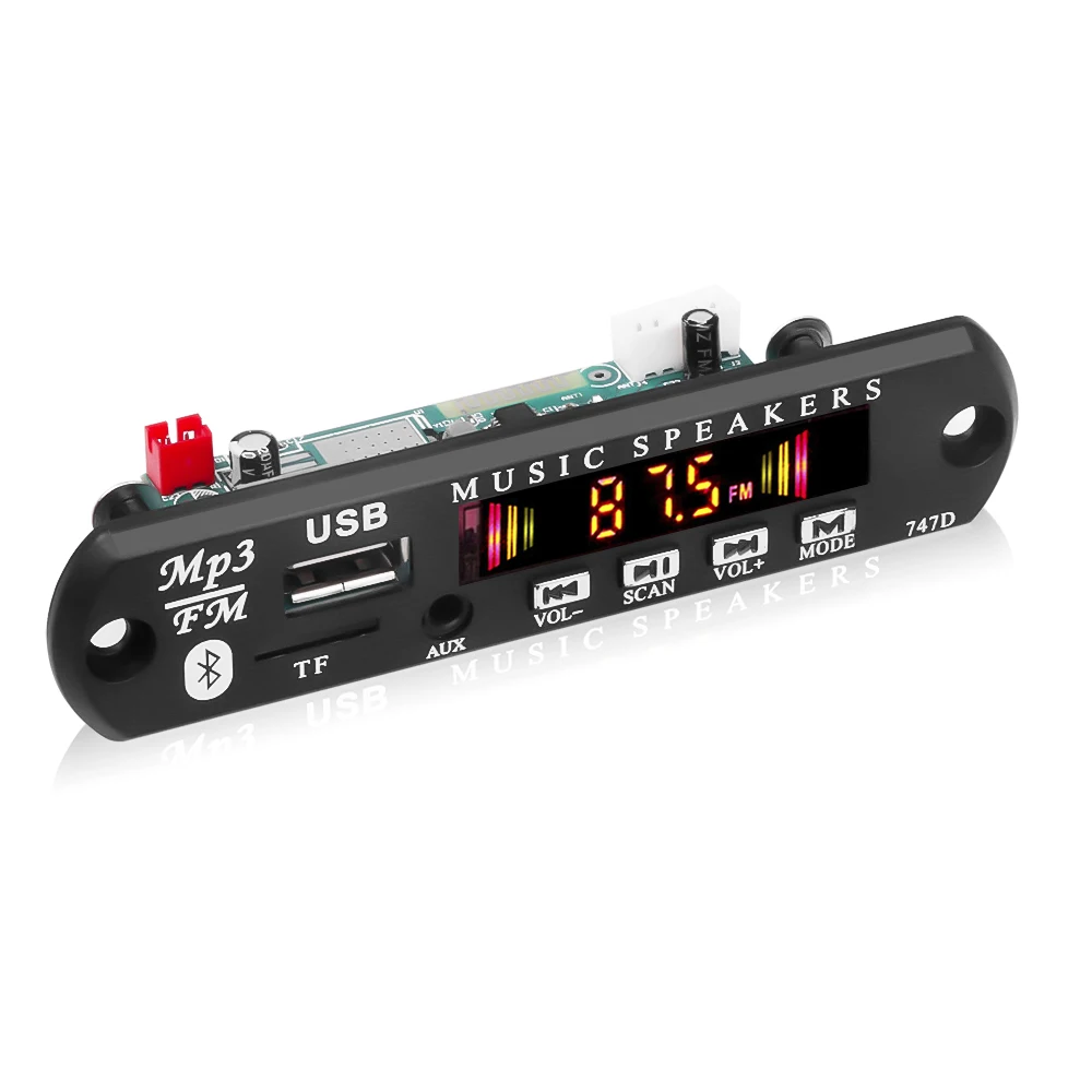 KEBIDU 5V Автомобильный Bluetooth MP3 декодер цветной экран WAV WMA декодирование MP3 плеер Hands-free USB/FM/TF/AUX аудио модуль записиОписание:* Потребляемая мощность продукта: менее 150 мА* USB: подключение к u-диску (максимальная поддержка 32 ГБ)* СВЕТОДИОДНЫЙ цветной экран: цифровой экран, красный экранИнфракрасный приемный модульTF: подключение к tf-карте памяти (максимальная поддержка 32 ГБ)AUX: аудио входной интерфейсVOL-: Короткое нажатие-последняя песня; Длинное нажатие-Уменьшение громкости.Воспроизведение/пауза: короткое нажатие-это переключатель между паузой и воспроизведением; Длительное нажатие-это автоматическая Радиостанция FM.VOL +: короткое нажатие, чтобы выбрать следующую песню; Длинное нажатие, чтобы увеличить громкость.Режим: Переключение USB/TF/FM/LINE IN/BLUETOOTH VoiceМастер IC: AC6926Bluetooth IC: AC6926 версия Bluetooth версии 5,0Формат музыки: MP3/WMA/WAV/FLAC/APE формат без потерьМощность: 2*3 Вт, подключен к двум динамикам 3 ВтРадио FM частота: 87,5-107,5 МГцВведение функций поддержки: поддержка MP3/USB/TF/LINE IN/FM/BLUETOOTH/дистанционное управление/DC 5VО конструкции: Размер панели: 107*25 мм, угол панели и положение отверстия винта, затем покрытие поверхности, глубина платы 32 ммОписание функции записи1. Нажмите кнопку MODE в течение длительного времени, чтобы начать запись, а затем нажмите кнопку MODE в течение длительного времени, чтобы отменить функцию записи.2. Нажмите кнопку воспроизведения/паузы, чтобы воспроизвести файл записи.3. При записи более необходимо подключить устройство хранения, например u-диск или tf-карту.