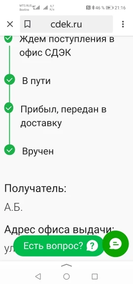 Продавец присвоил другой трек номер моему заказу,заказ на сайте считался что вручён, открыл спор , вернули деньги, невниманий продавец только время потратил!!!!