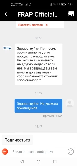 Продавец долго не отправлял товар, после того как прошло несколько дней с момента оплаты статус изменился и посылка была отправлена. Спустя почти 2 недели товар перешёл в статус "доставлен", я решил проверить номер отслеживая и выяснилось что номер был неправильный, продавец вообще не отправлял мне товар а намеренно указал другой номер отслеживания. Общение с продавцом ни к чему не привело, отвечает очень долго и как то глупо отмазывается. НЕ рекомендую данного продавца, я очень НЕ доволен.