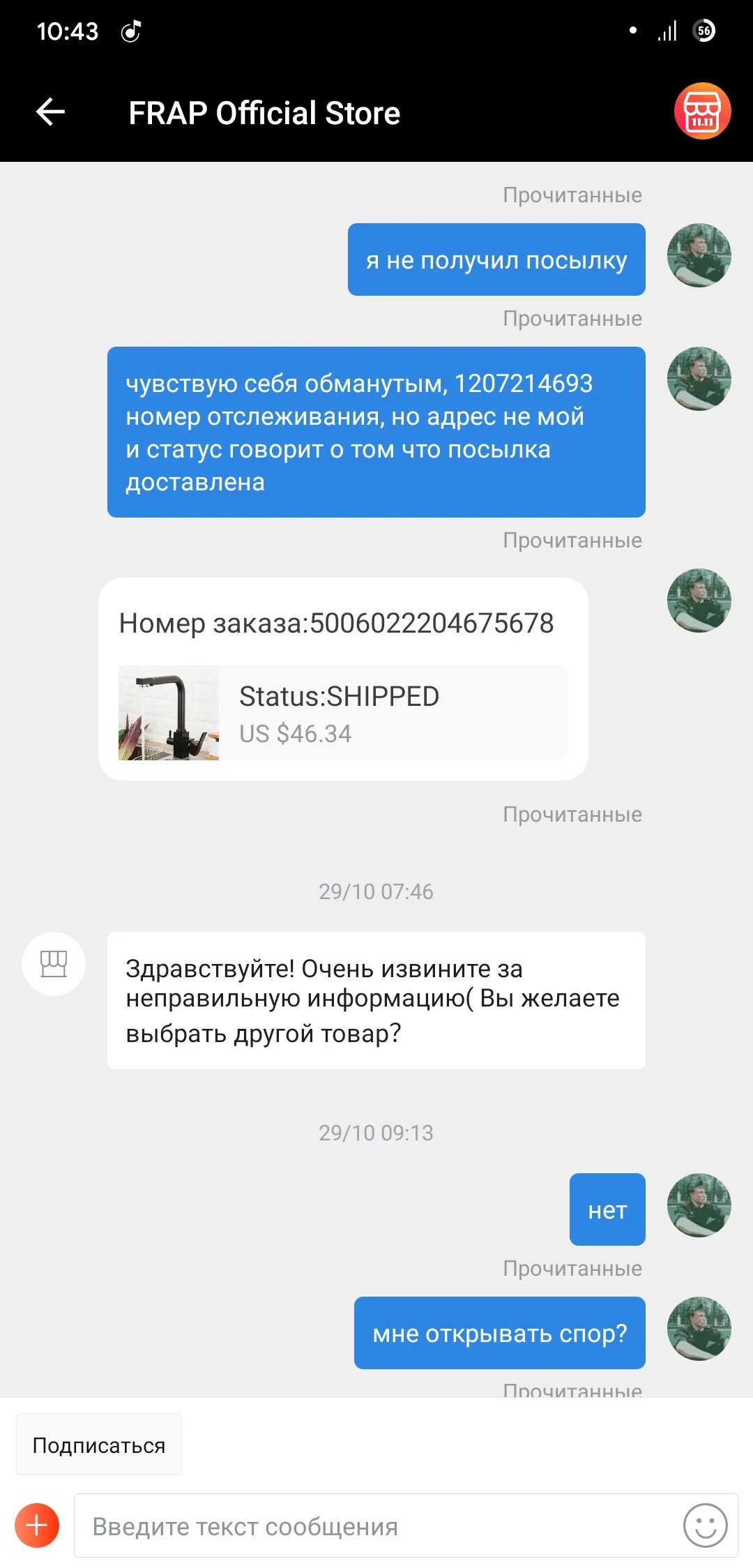 Должны были отправить смеситель из России, в итоге две недели и отправили совершенно другому человеку ! Попытались навязать смеситель дороже, а потом закрыть спор до возврата денег, в итоге ждали решения алиэкспресс, продавец даже не согласен со своим косяком.