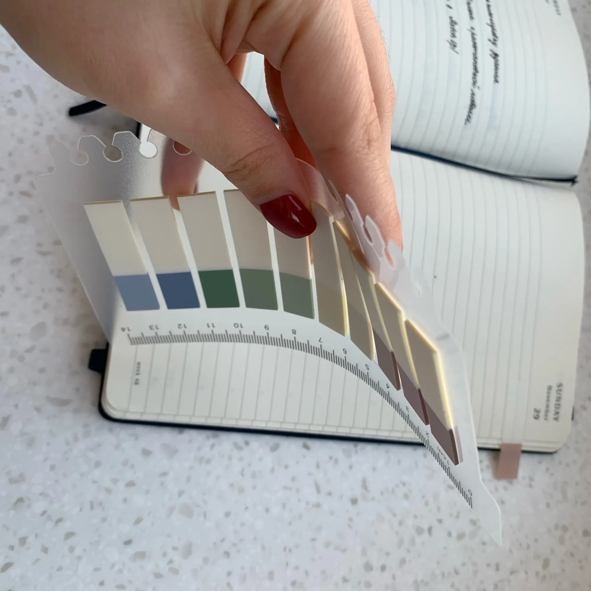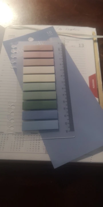 Отличный товар. Заказ шёл 15 дней. Доставкой довольна - очень быстрая. Закладки матовые, приятный на ощупь. Думала, что они на пластмассовой линейке, но нет. Это гибкая, но в меру твёрдая обложка. Ничего не выпало, не сломалось. Заказом и товаром довольна. На фото можно посмотреть размер, в соотношением с ежедневником а5.