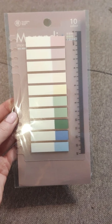 Прекрасные наклейки. Цвета пастельные, эстетически приятные, соответствуют изображению. Размер одной закладки 4,5*1 см. Основа прочная, можно использовать как линейку. Также есть отверстия для крепления на тетрадь с кольцами. С продавцом общаться не пришлось. Все пришло в срок. Спасибо)