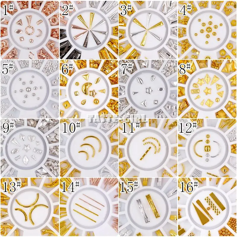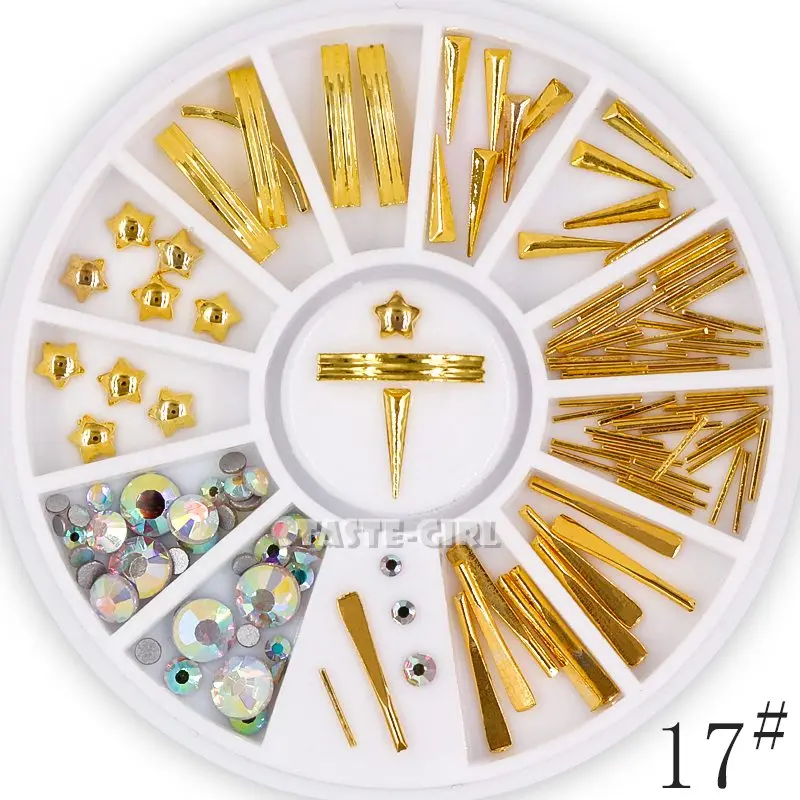 1 колеса Mix Формы Смесь цветов различные металлические заклепки камни Изогнутые Бары Stripes бусы икрой сплав для дизайна ногтей наклейки со стразами DIY