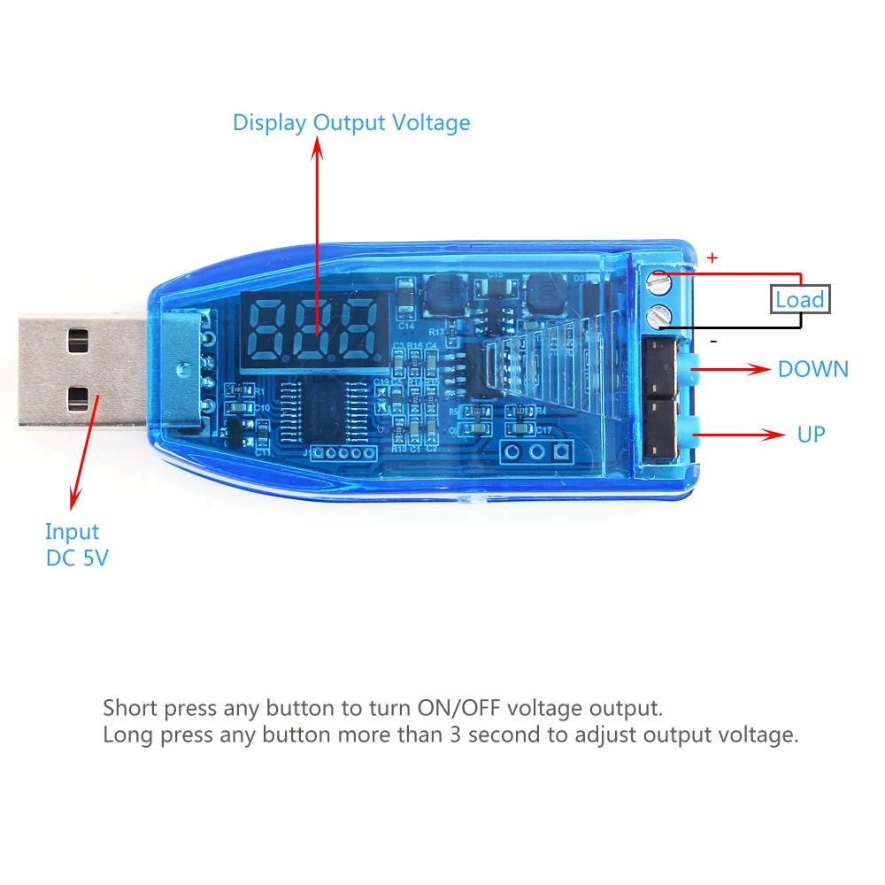 Повышающий и понижающий преобразователь напряжения USB, модуль питания с зеленым дисплеем, Боковая кнопка регулировки DC-DC, 5 В до 3,3 В, 9 В, 12 В, 24 В