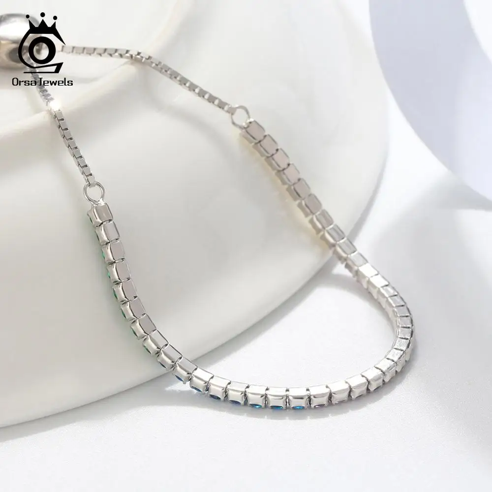 ORSA JEWELS Настоящее 925 стерлингового серебра браслеты и браслеты сверкающих ААА CZ голубогорозовогозеленогоКамень Теннисный браслет ювелирных изделий из серебра OSB42