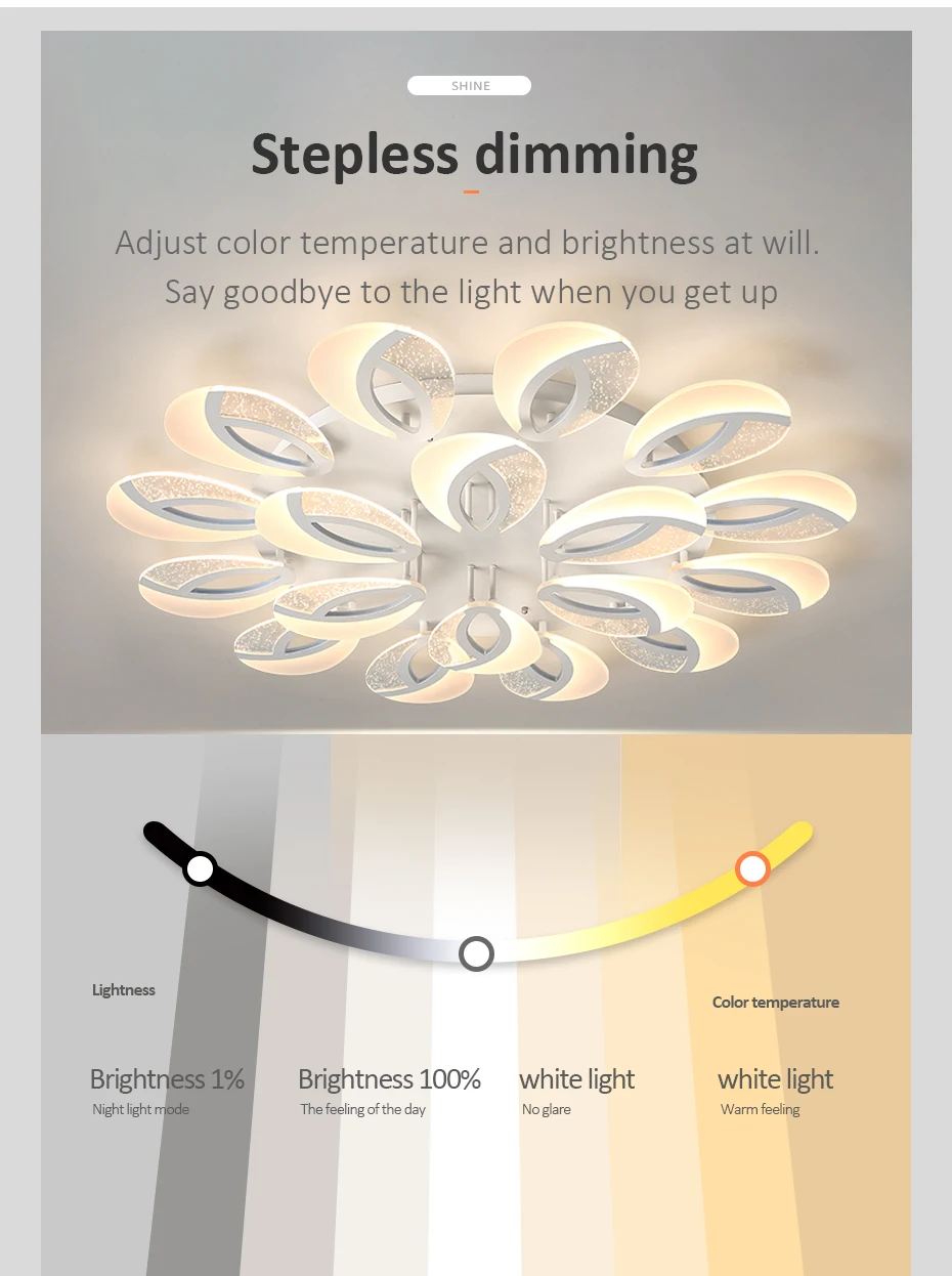 продавец молодец отвечал на все вопросы.Люстру доставил курьер уже через 3 дня.Красивая светит хорошо.Свет белый ,теплый,холодный.Яркость регулируется.Сначала думали пульт не работает,но потом настроили.Рекомендую.