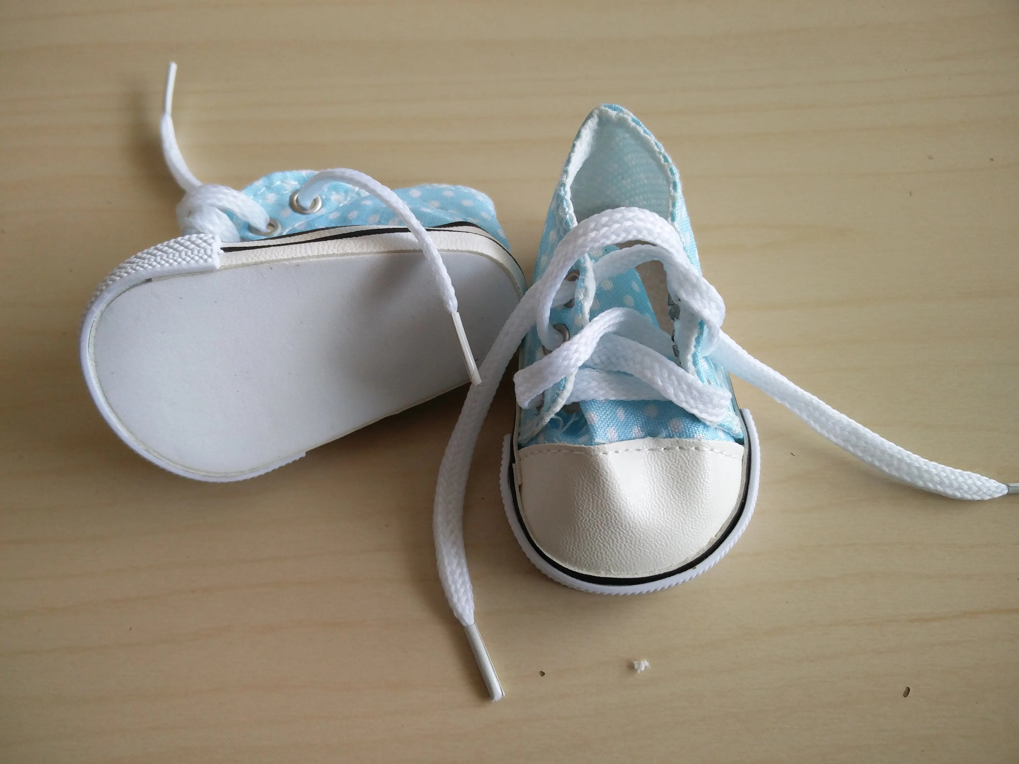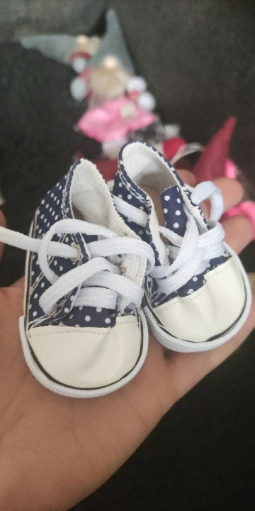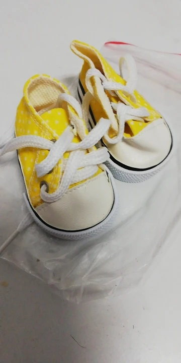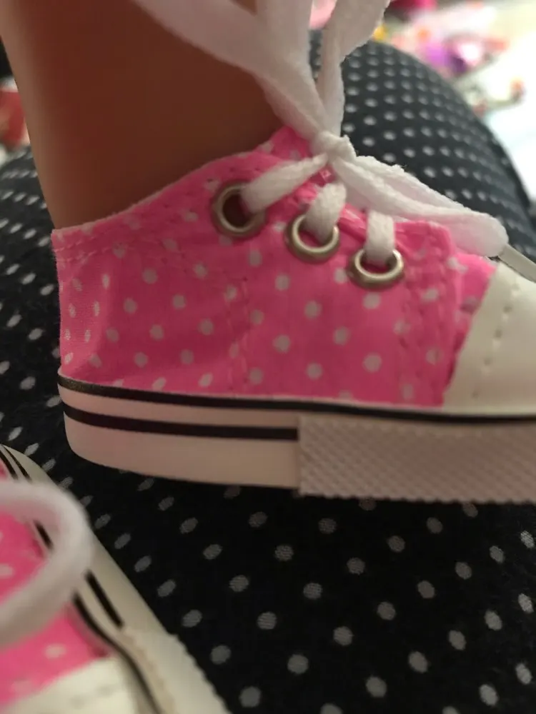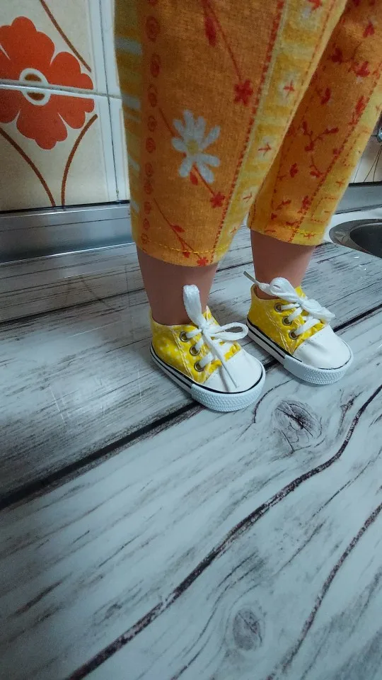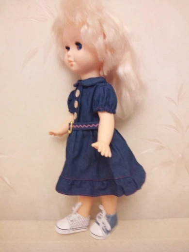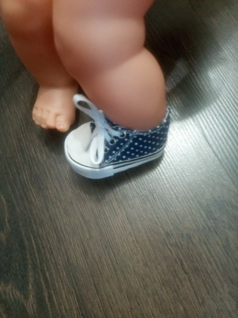 Сделаны хорошо, только ткань в горошек тонкая, не для игры. Пришли два кеда правильно на правую и левую ногу, на фото это для сравнения . подошли на куклу времён СССР, рост 46 см с длиной стопы 6 см и шириной 3,5 см. есть запас для носка. Для игры быстро кеды расползутся, а если просто постоять нормально. И платье тоже с алика , широковато в талии но можно ушить.