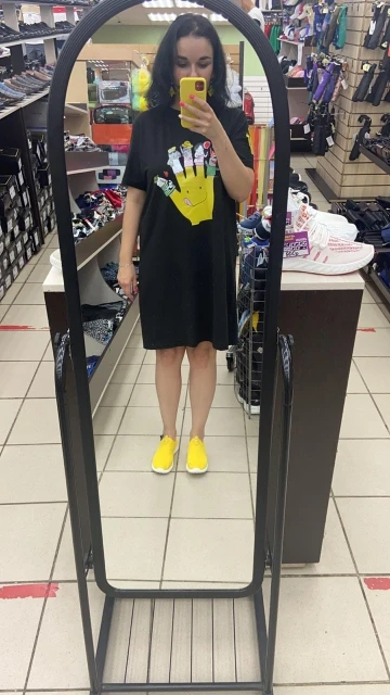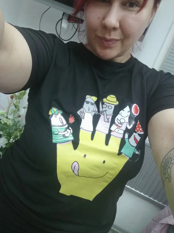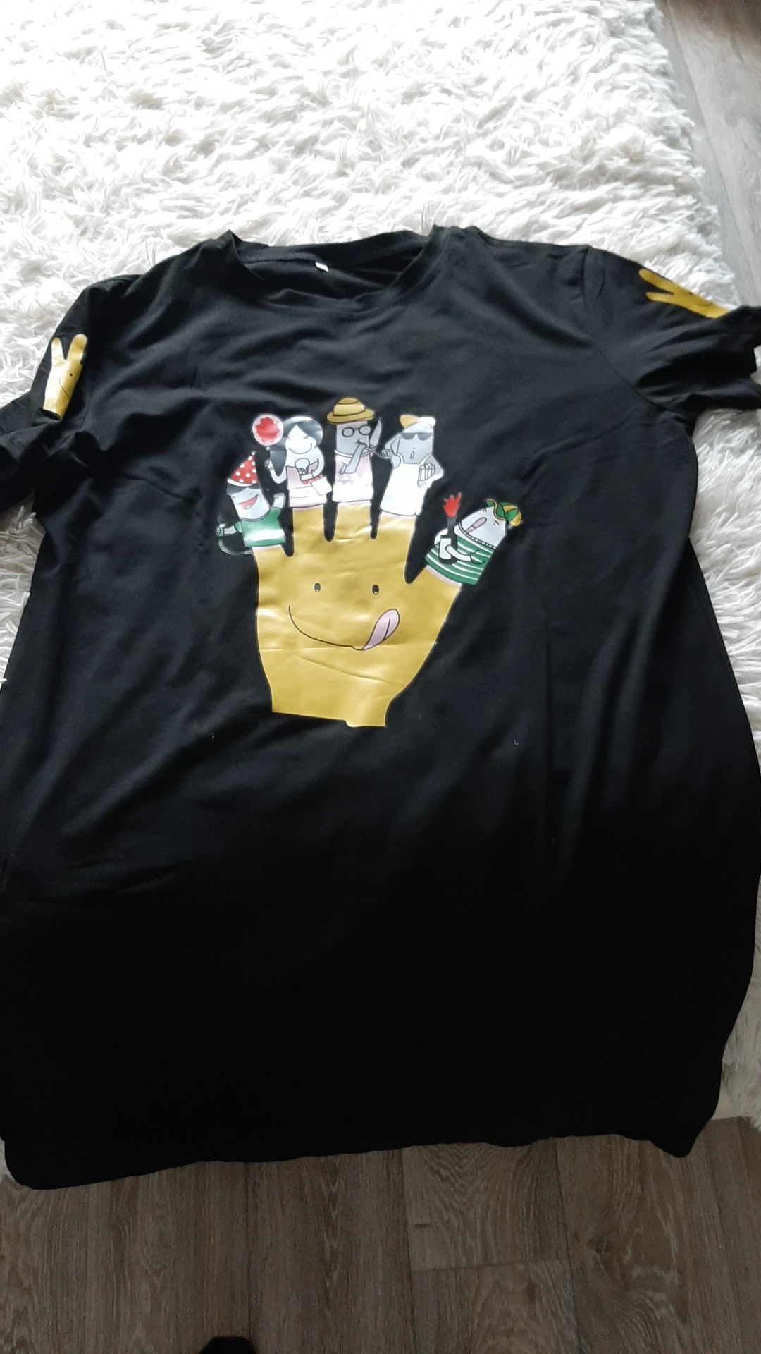 Ткань немного эластичная, я думал, что она более жесткая, хотя она не тонкая и мягкая. Рисунок руки оригинальный, но цвет более горчичный желтый, чем желтый, как показано на картинке. Вы должны выбрать большой размер (модель белого + XXXL), так как он немного прикреплен к телу.